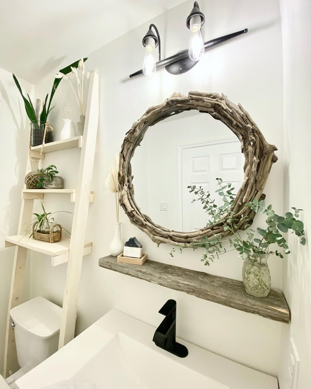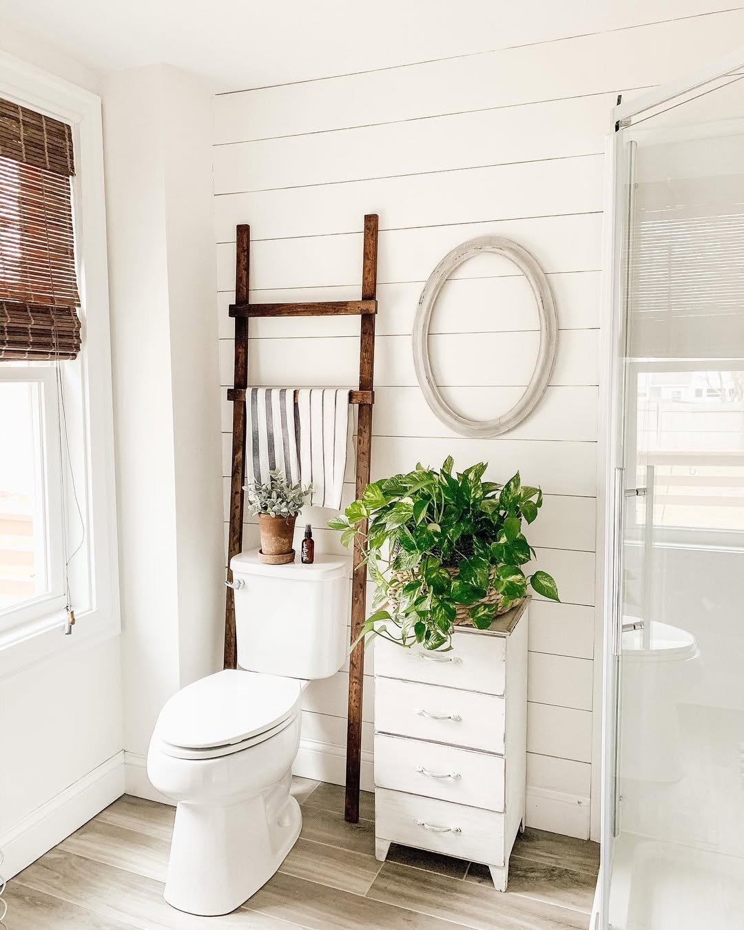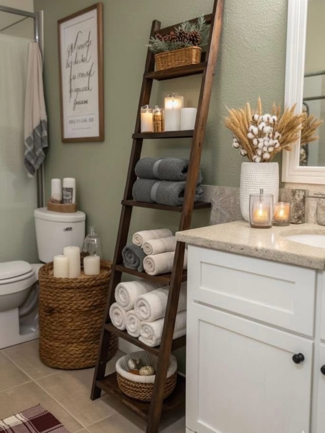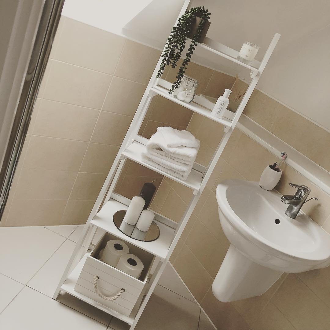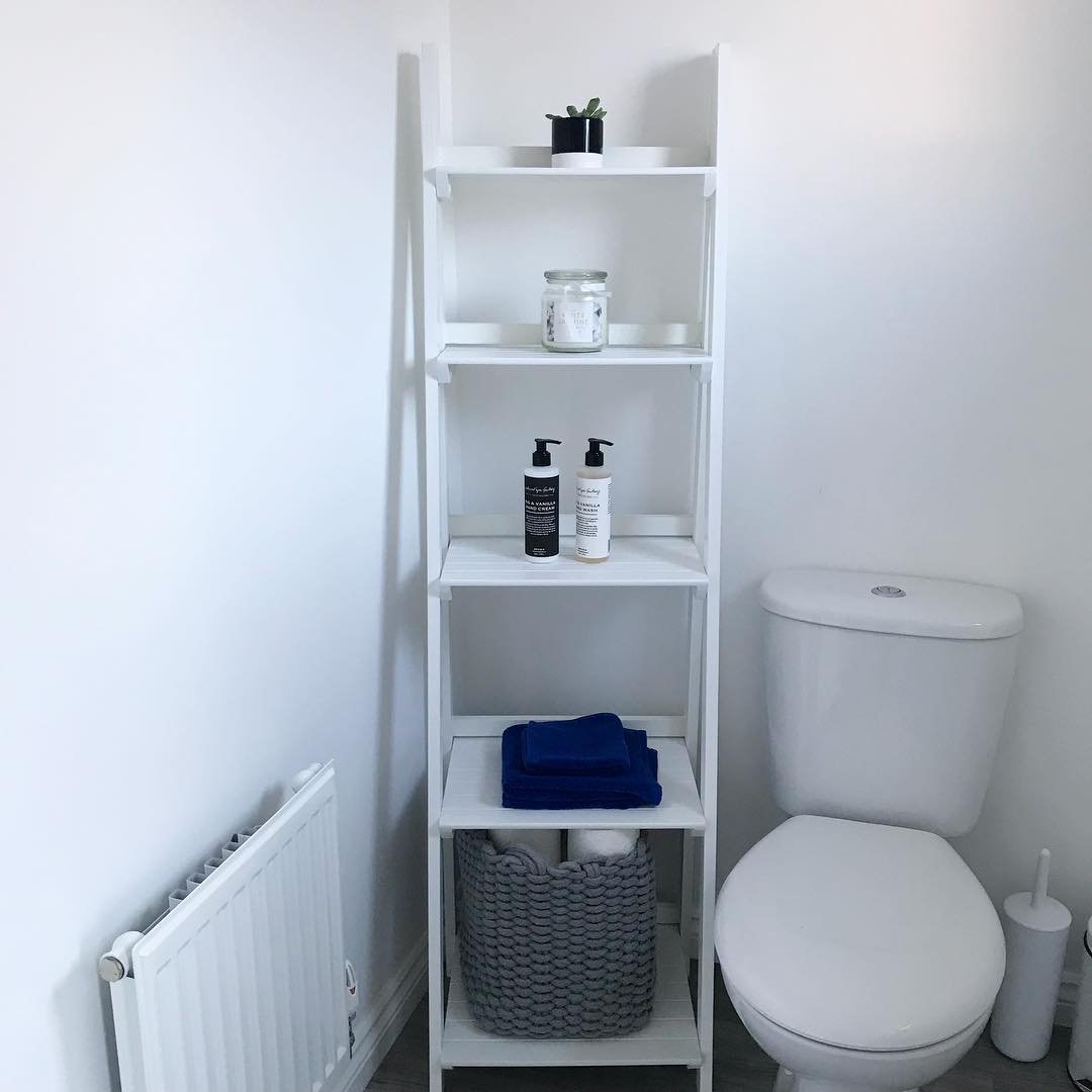 Now this is smart use of space. A ladder shelf placed right over the toilet turns a dead zone into prime storage real estate.