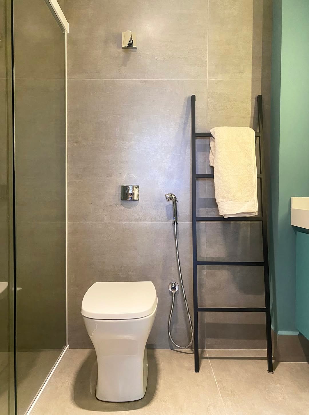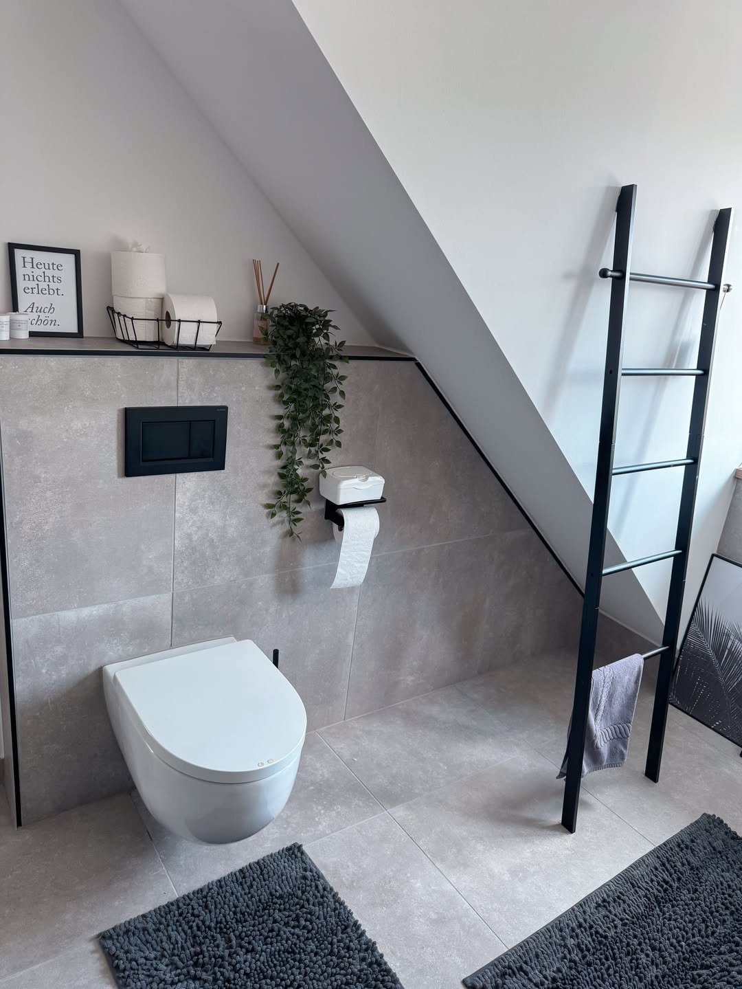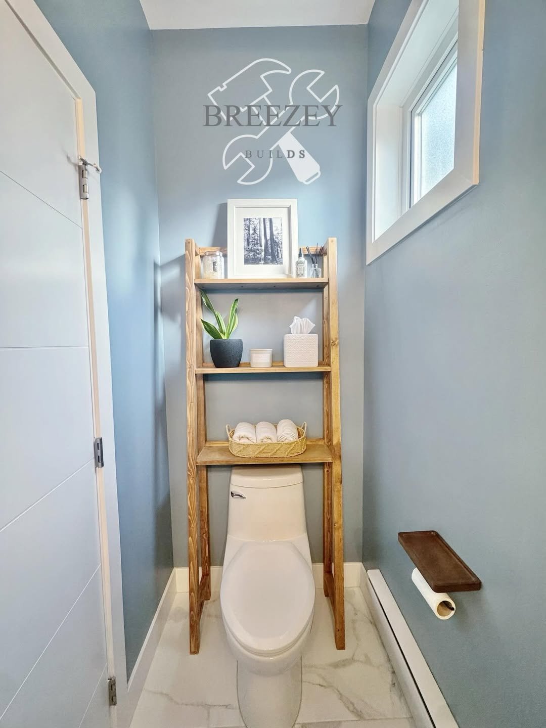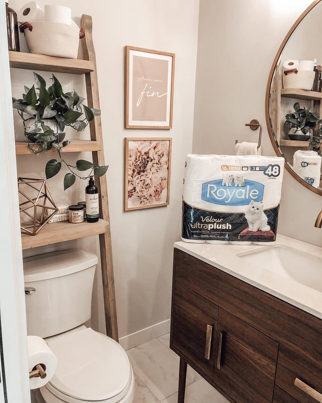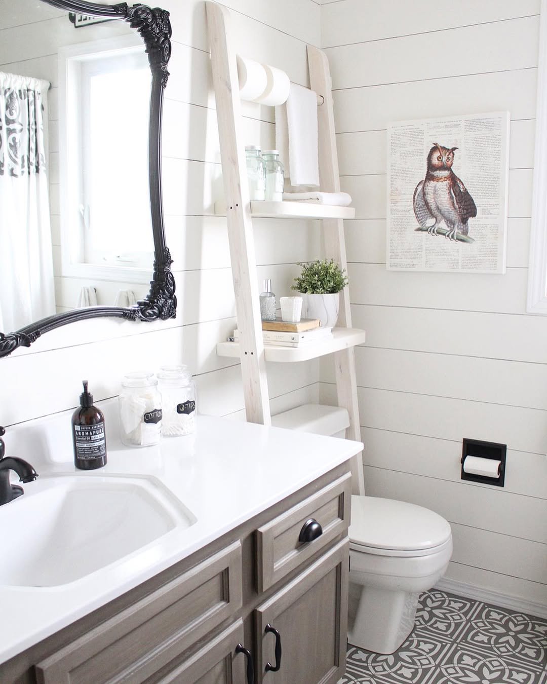 Now this is smart use of space. A ladder shelf placed right over the toilet turns a dead zone into prime storage real estate.