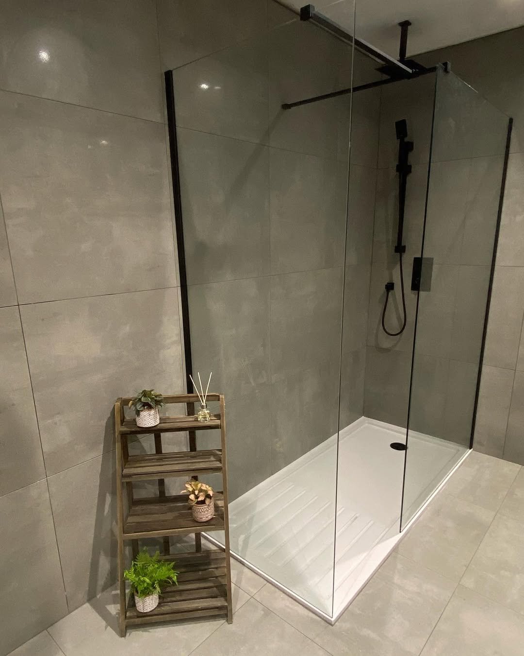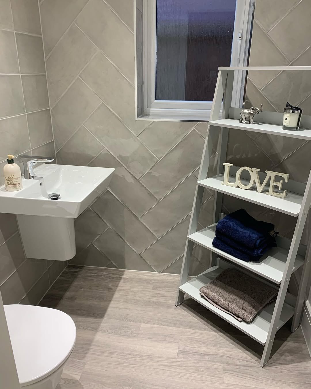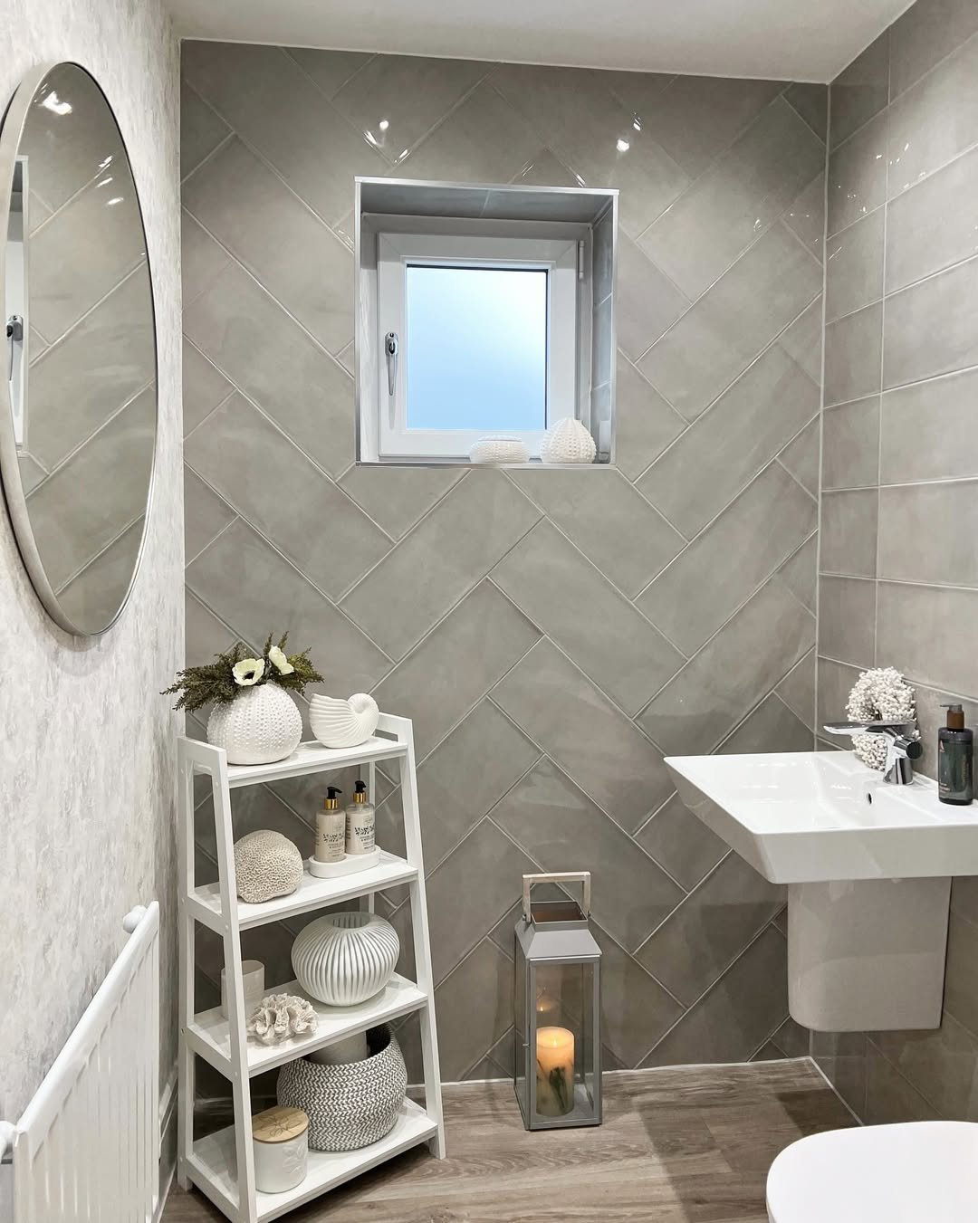 There’s something really calming about this setup. The soft grey tiles, the delicate decor pieces, and that perfectly styled white ladder shelf—it all feels balanced without trying too hard.