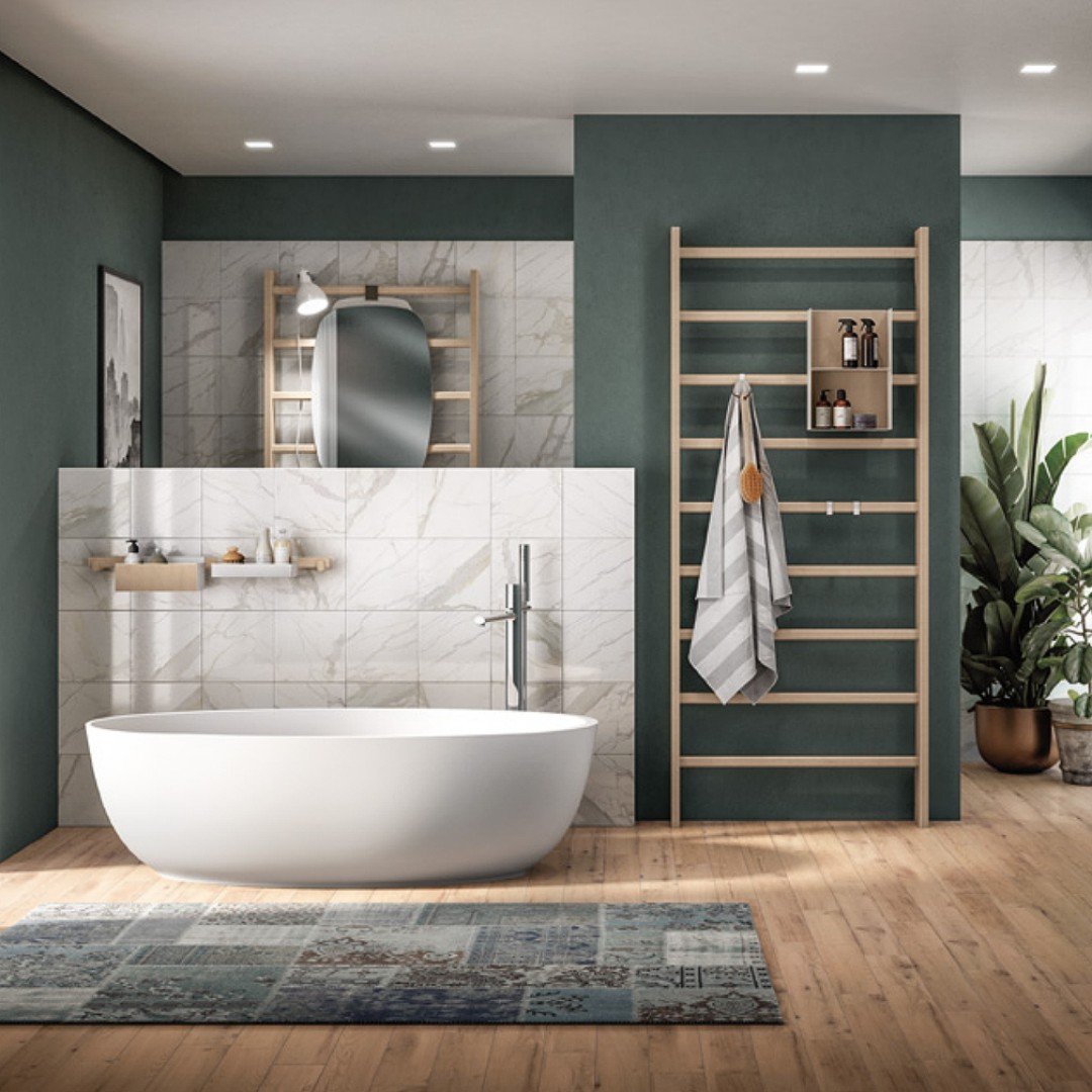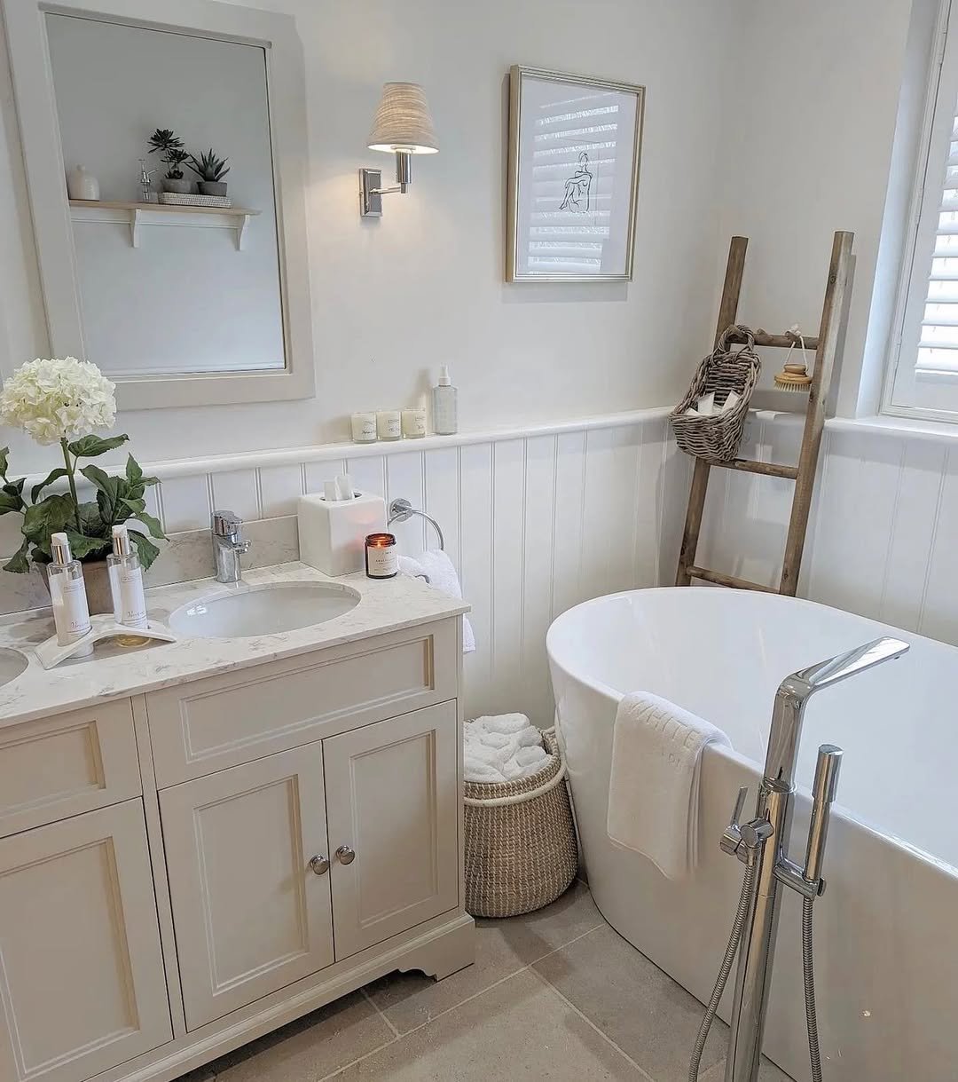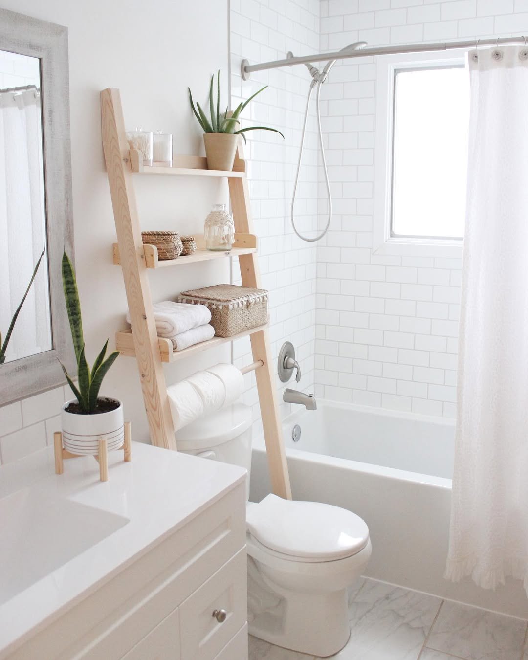 This one feels bright, fresh, and super easy to live with. A compact ladder shelf tucked neatly beside the tub, layered with towels, a basket, and a trailing plant doing its thing.