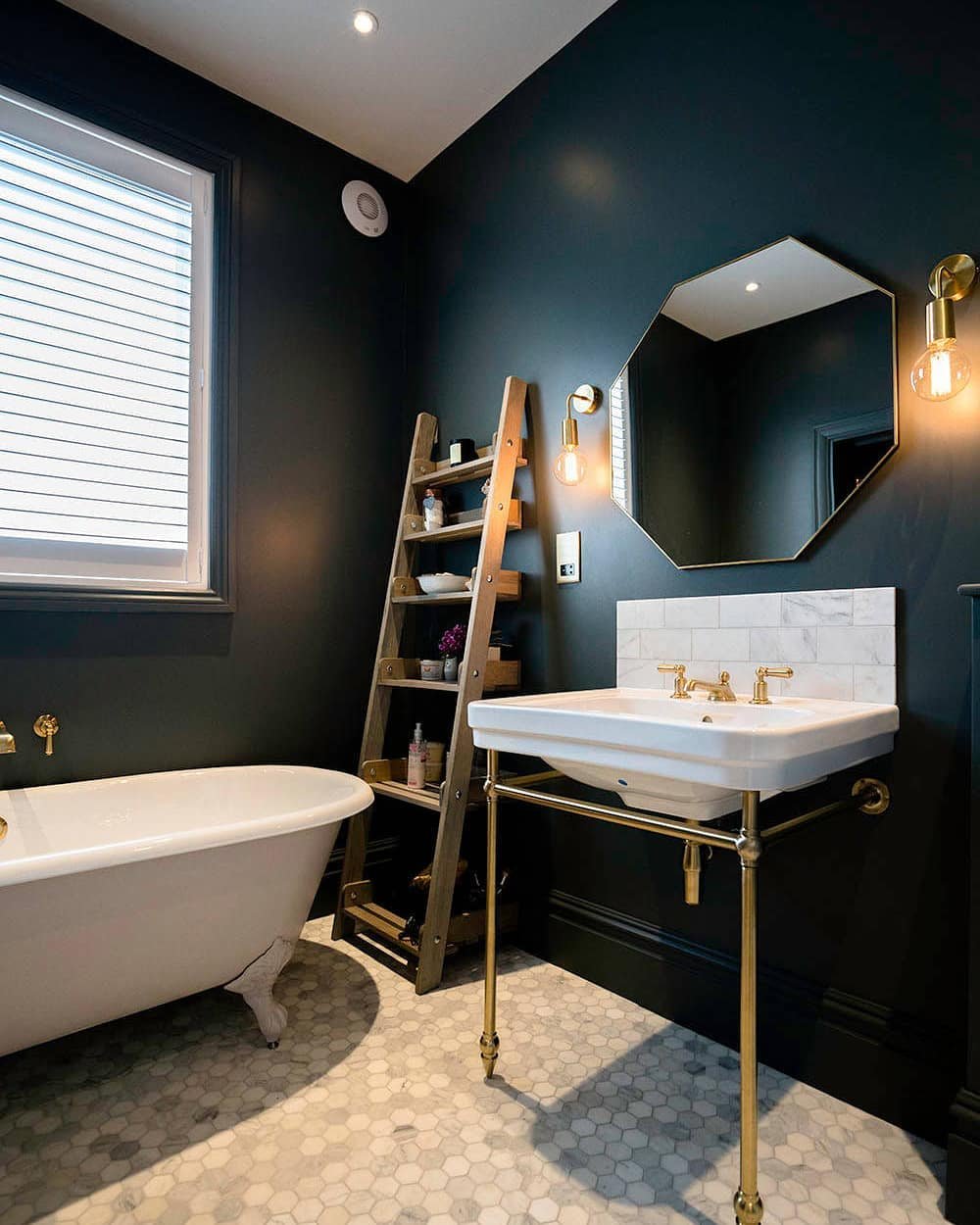 Dark walls, brass fixtures, and then that warm wood ladder shelf stepping in—it’s such a good contrast. It softens the whole look without taking away the drama.