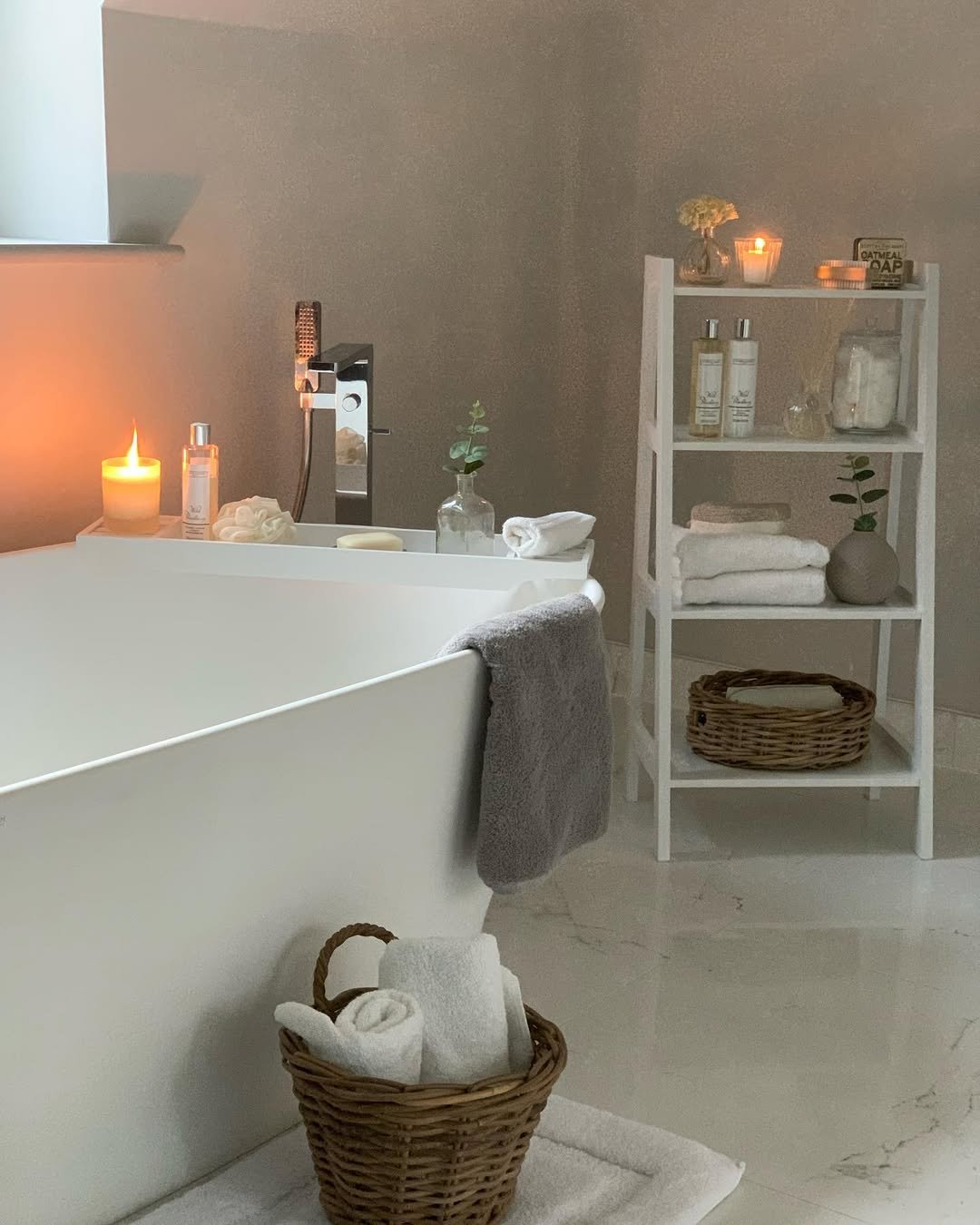 This one leans fully into that calming, spa-like aesthetic. Neutral tones, soft towels, and a little glow from candles—it’s giving unwind mode instantly.