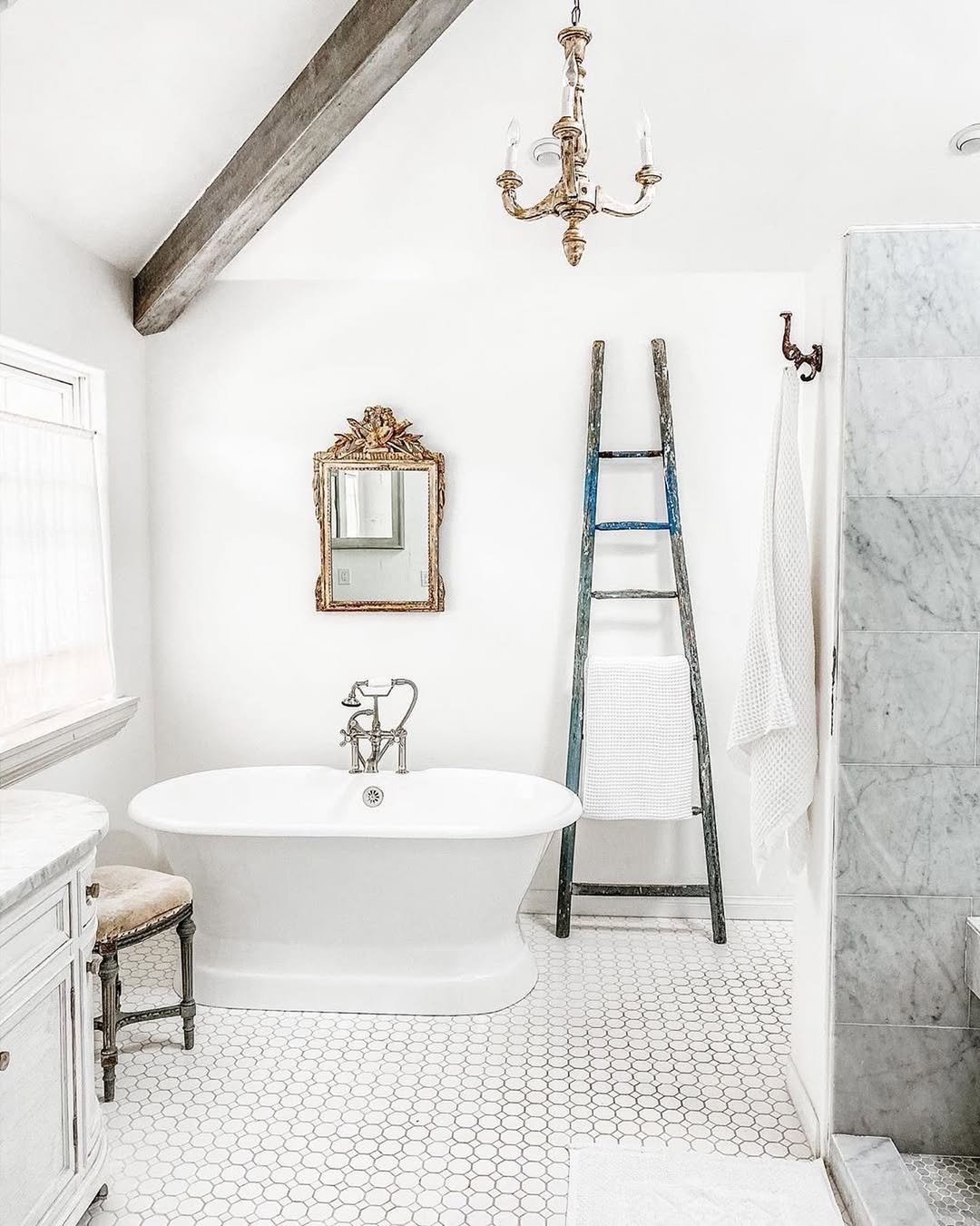 The ladder shelf just pulls everything together. It’s warm, inviting, and makes you want to stay in there a little longer than necessary.