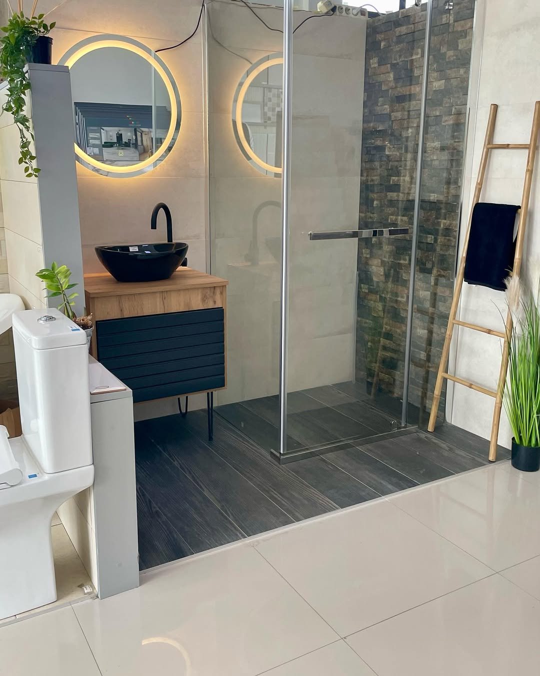 Black ladder, white tiles, greenery—this combo never misses. The contrast is sharp, but the styling keeps it from feeling too stark.