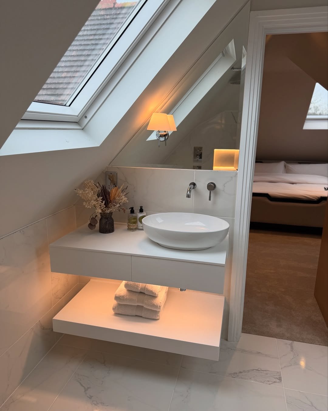 It’s the kind of bathroom where you’d actually want to slow down. Nothing feels rushed or overly styled—it just quietly wraps you in comfort.
