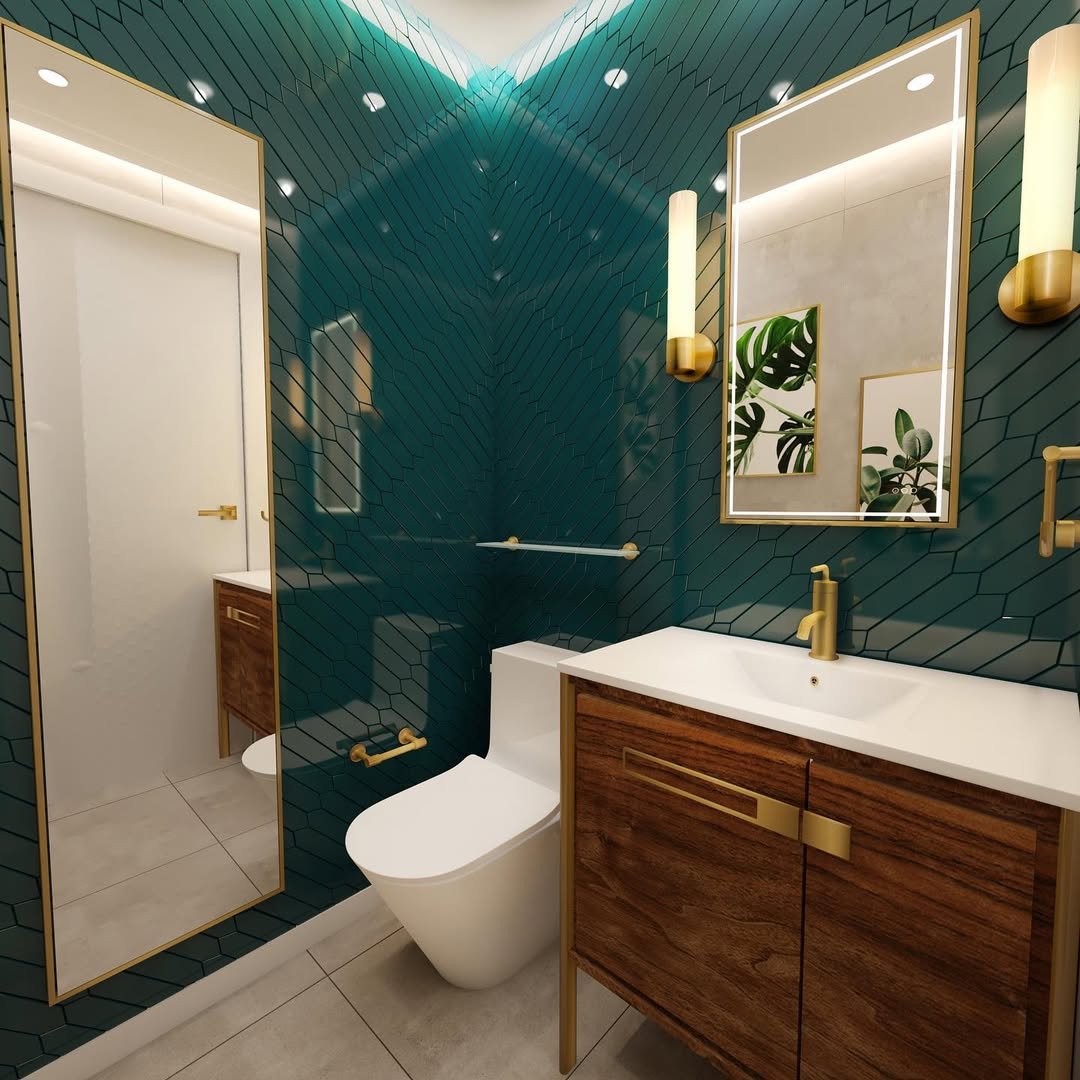 This space plays with contrast in such a smart way. The deep green tiles paired with those gold-accented light fixtures? Instantly eye-catching.
