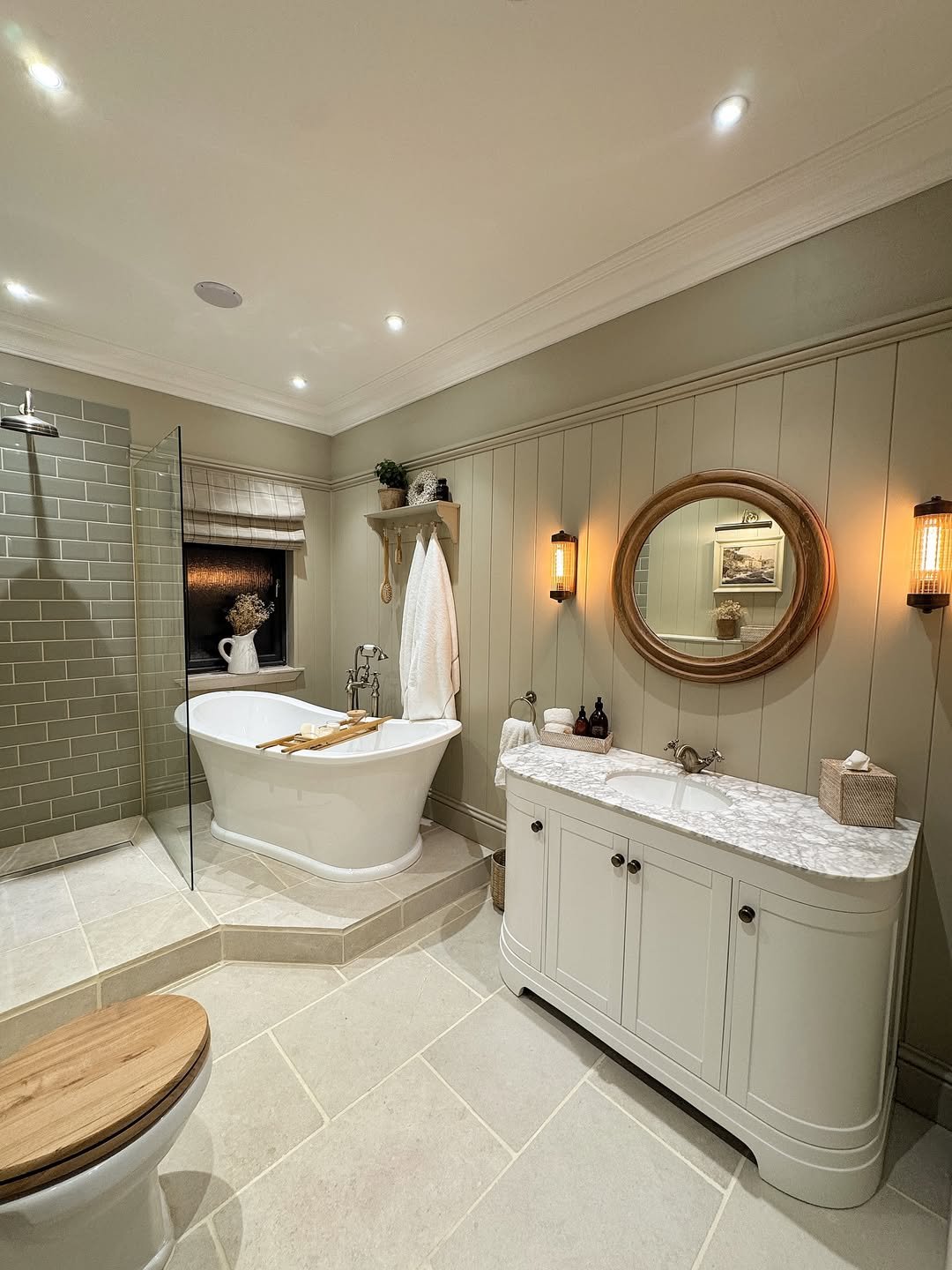 This one has that cozy, countryside charm nailed. Panelled walls, soft tones, and warm sconces create a space that feels instantly inviting.