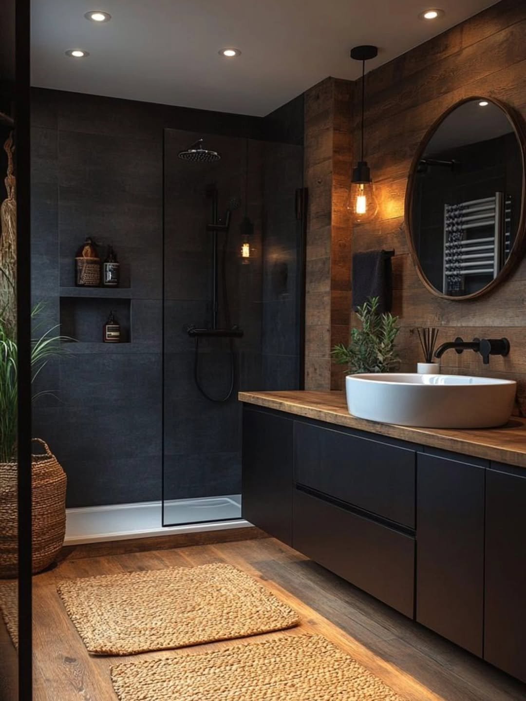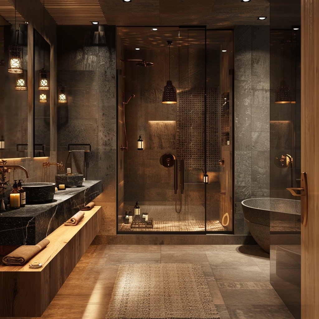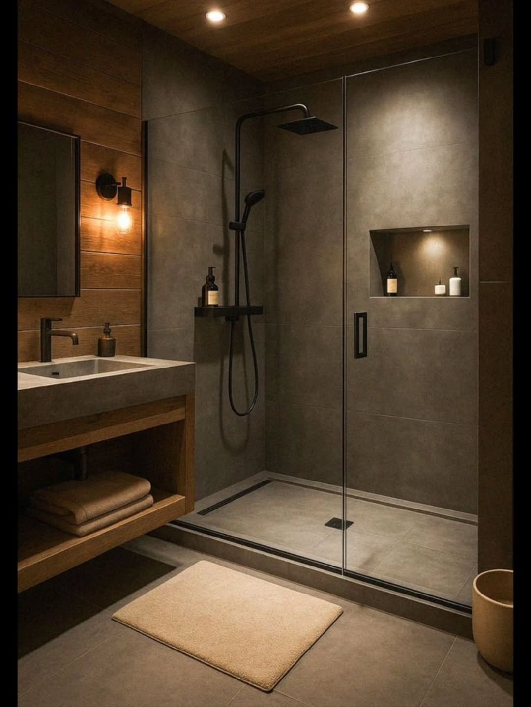 This bathroom leans all the way into that cozy, spa-at-night vibe. The warm pendant lighting paired with those soft recessed ceiling lights creates layers that feel intentional, not overwhelming. It’s not just about brightness—it’s about mood.