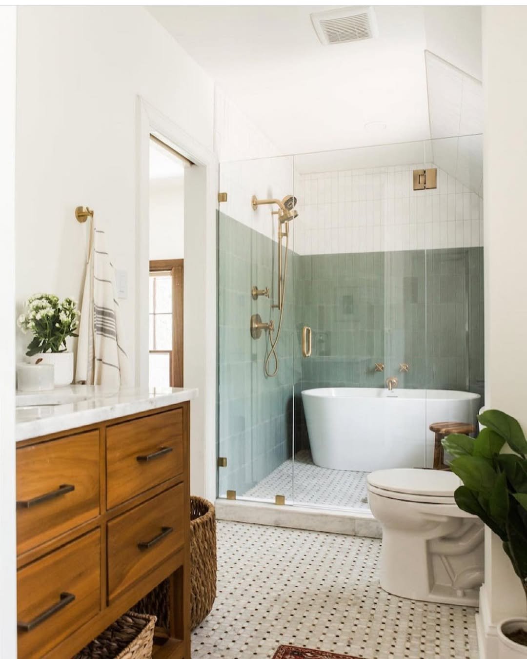 This space is bright, crisp, and just a little playful. The soft green tile paired with white tones keeps things feeling fresh and clean.