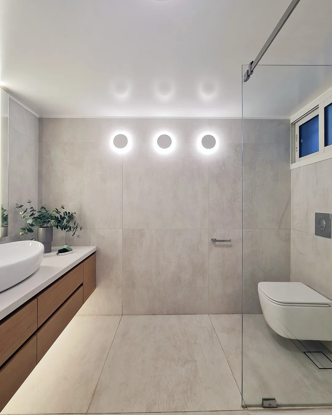 This bathroom keeps it simple, but adds just enough glow to elevate everything. The backlit oval mirror creates a soft halo effect that feels modern without being cold.