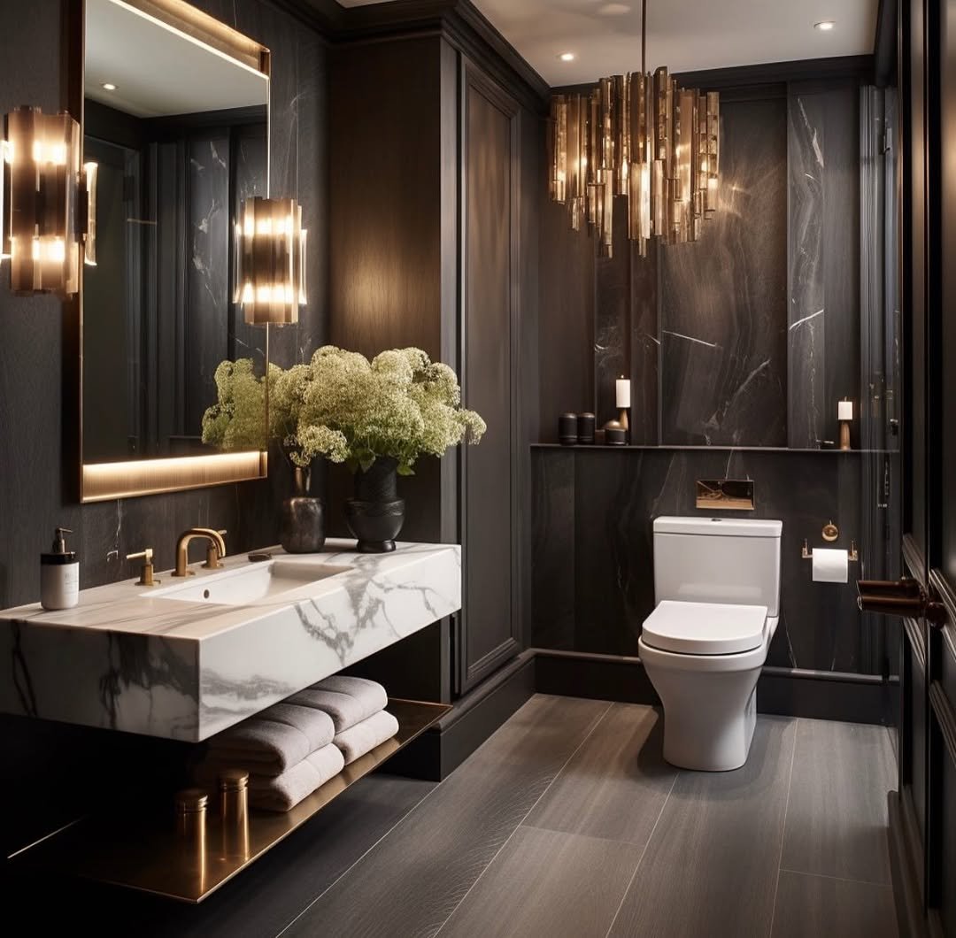 But what really makes it click is the balance. The marble vanity and soft under-lighting keep things from feeling too heavy. It’s bold, yes—but still polished and incredibly refined.