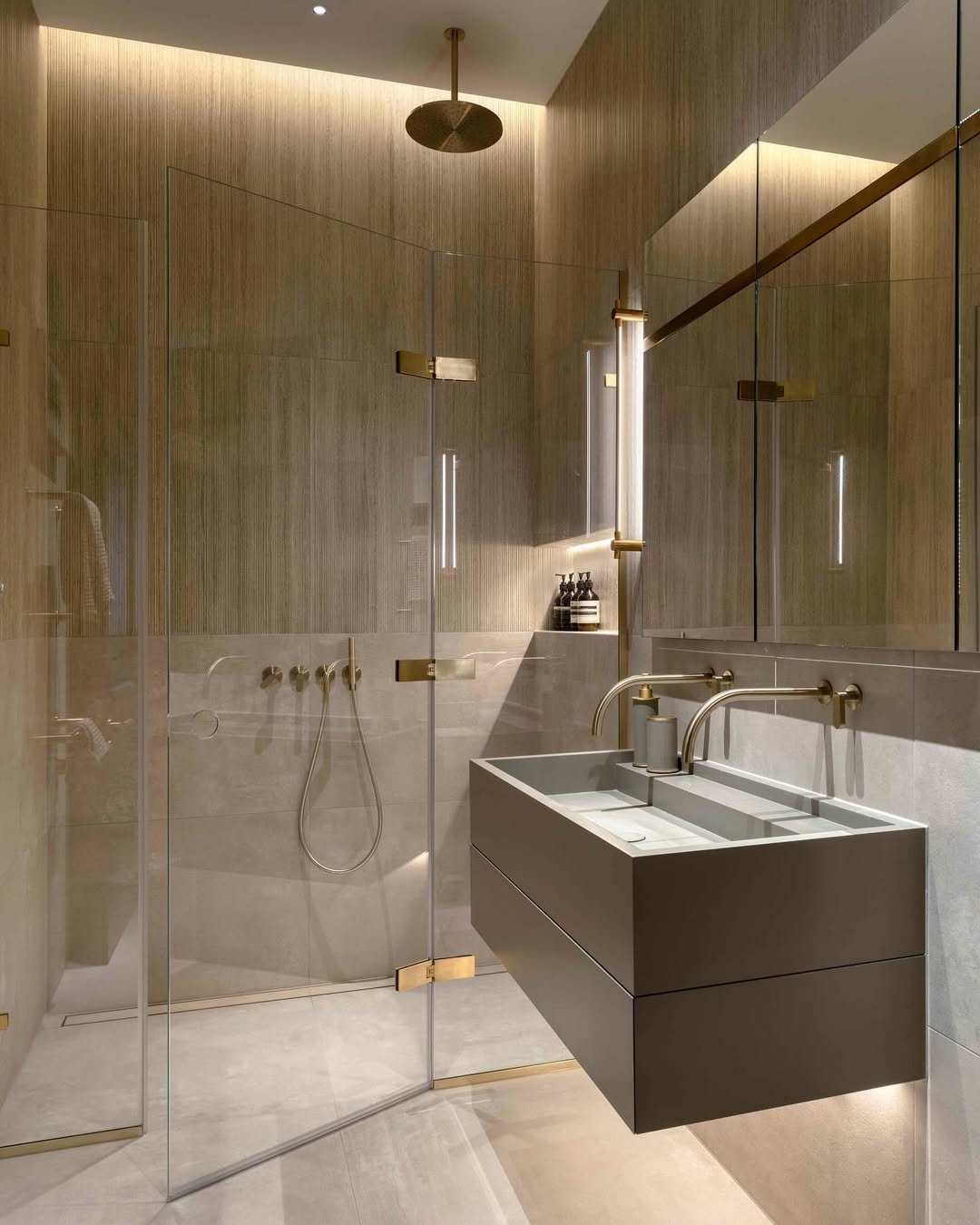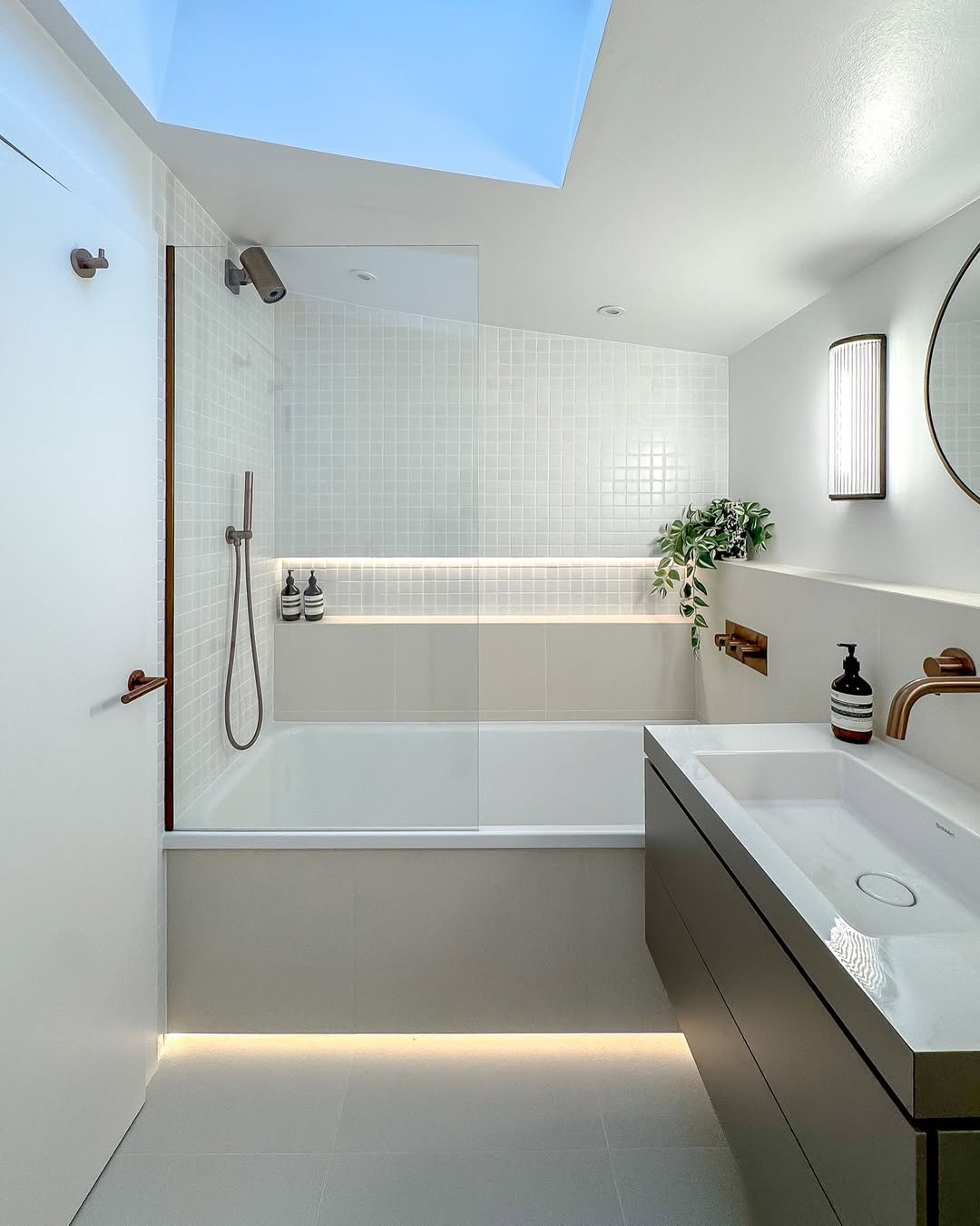 This one goes full modern—and owns it. The linear LED strips across the ceiling and mirror bring a sleek, futuristic edge to the space.