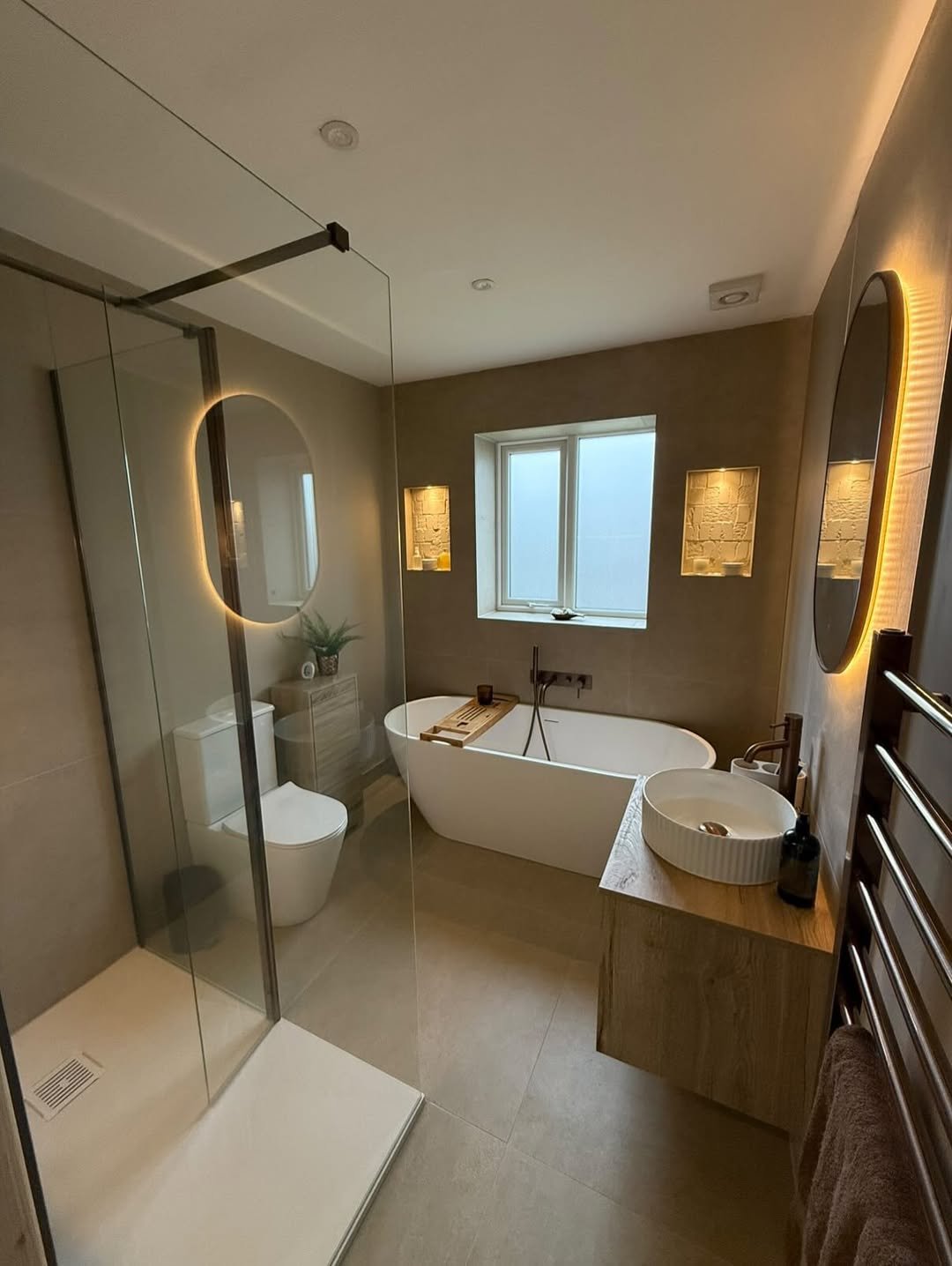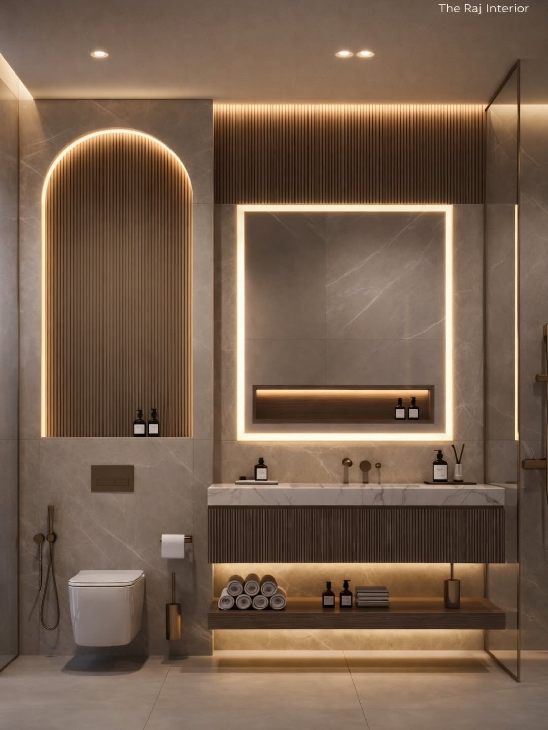 This one leans into warmth in the best way. Soft ambient lighting, subtle highlights, and a cozy glow that makes the whole bathroom feel like a retreat.