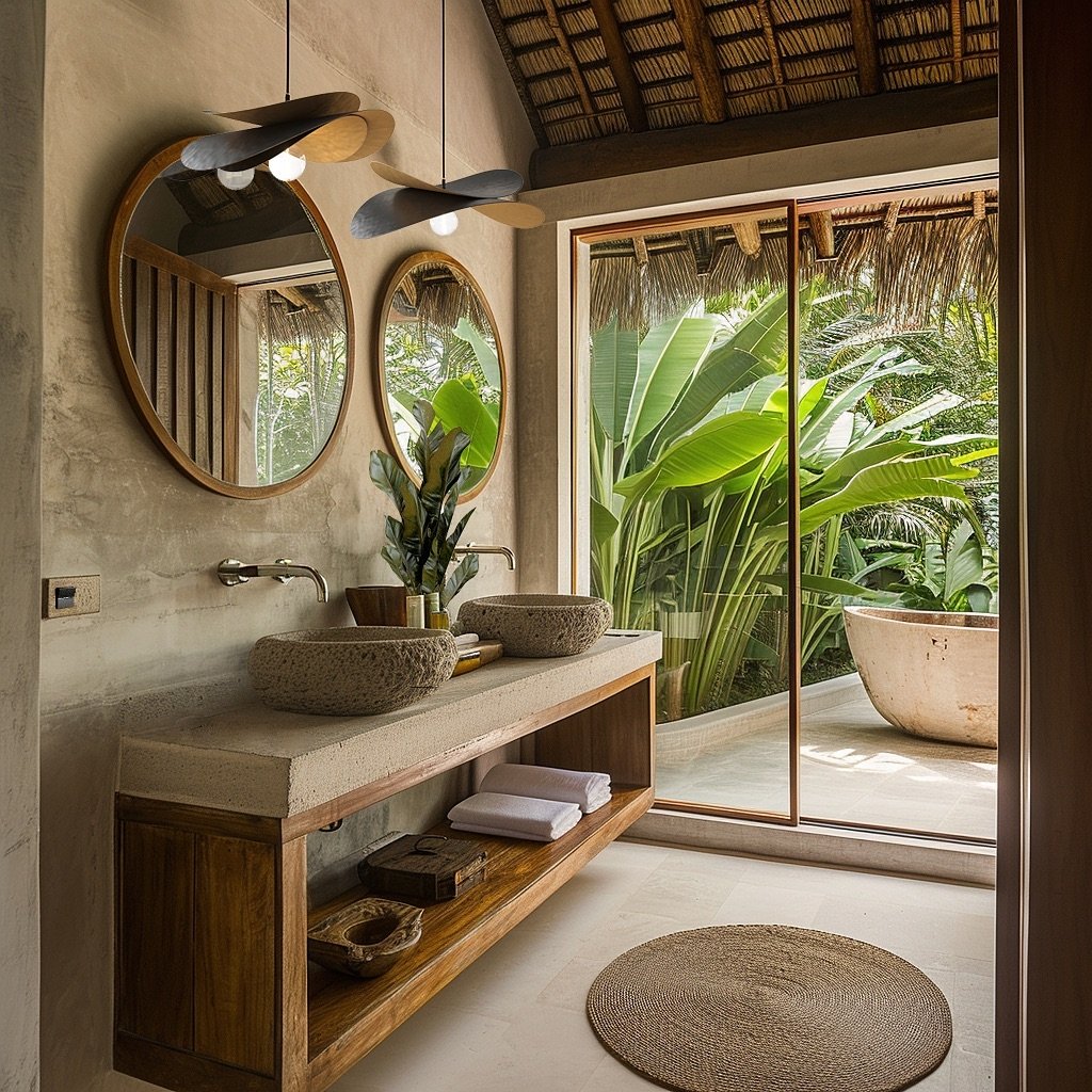 This one feels like stepping into a boutique resort. Natural textures, warm wood, and those open views to lush greenery—it’s basically a spa day waiting to happen.