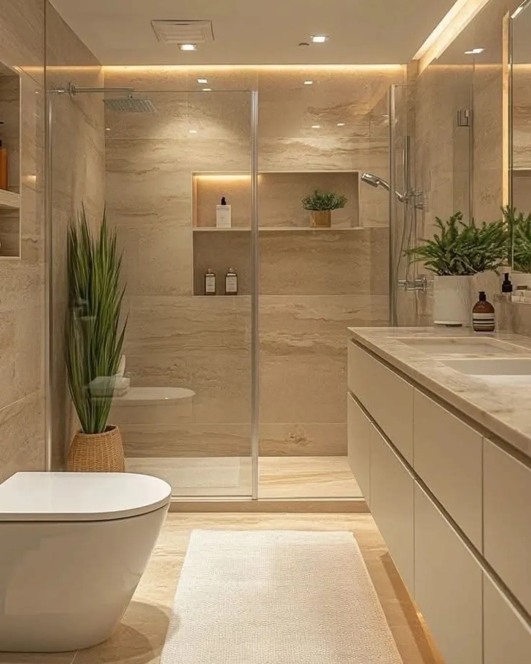 Everything here feels soft, warm, and inviting. The recessed lighting combined with niche lighting creates that perfect spa-like glow.