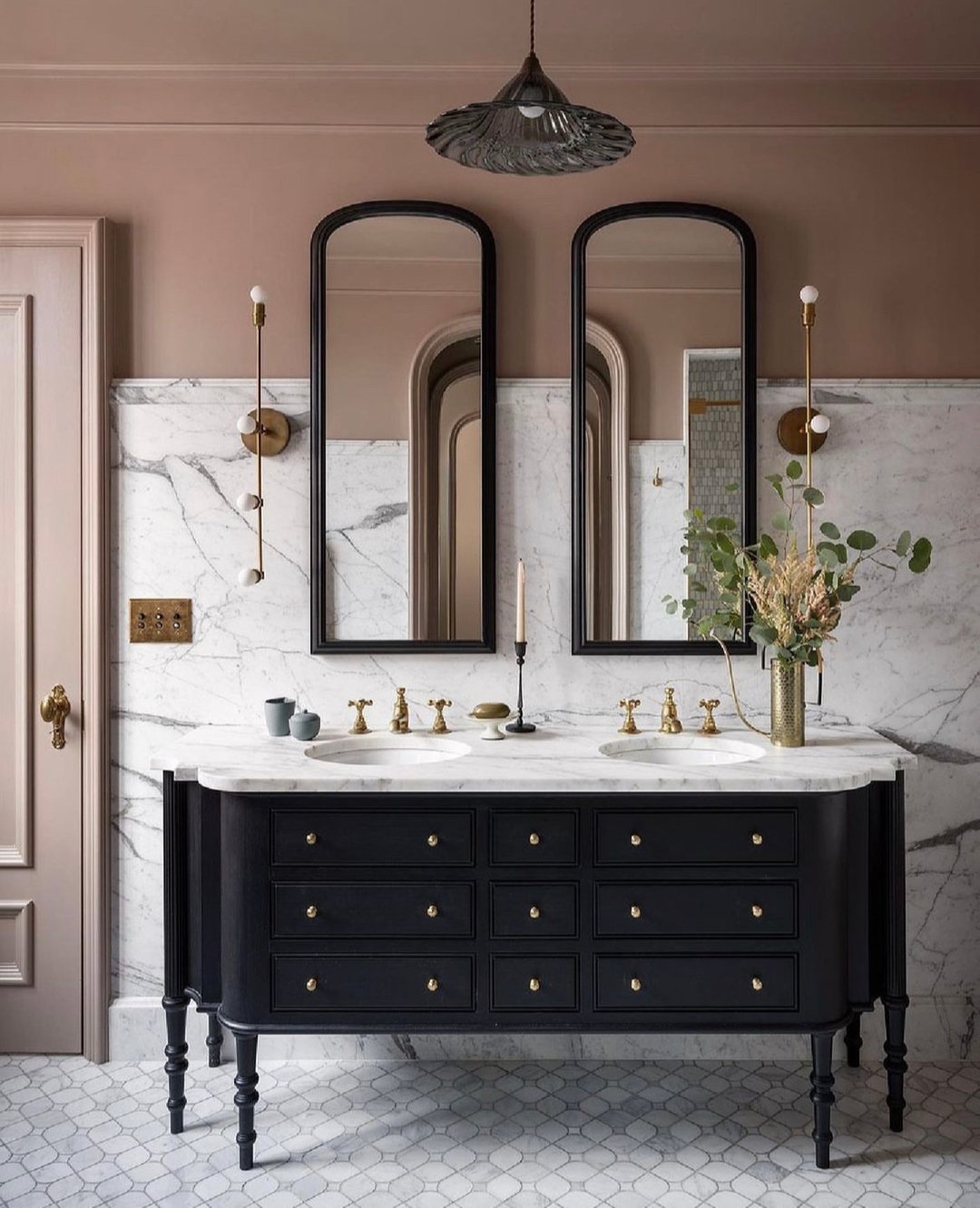 This is soft luxury done right. The blush-toned walls against that dramatic marble backdrop feel polished but still inviting.