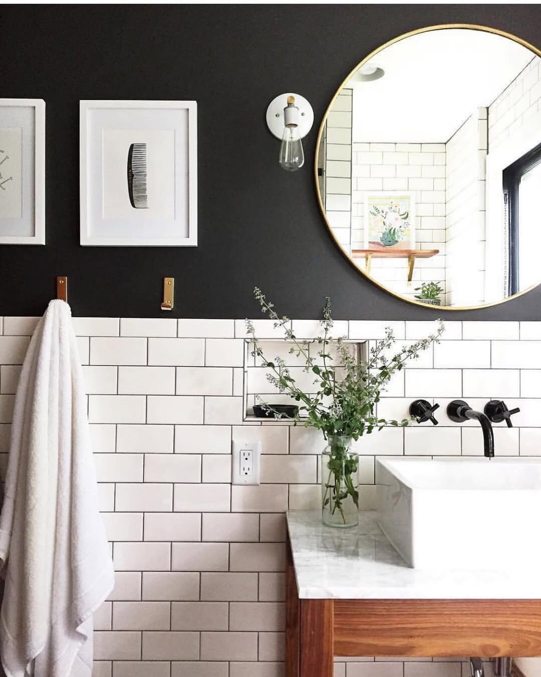 This is contrast done right. The deep black upper wall against those classic white tiles instantly adds depth and a bit of edge.