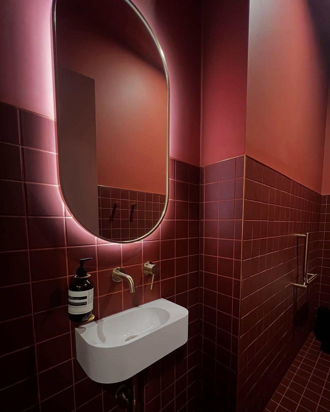 This one doesn’t hold back—and honestly, it shouldn’t. The deep red tiles and soft backlit mirror create a moody, almost boutique-hotel vibe.