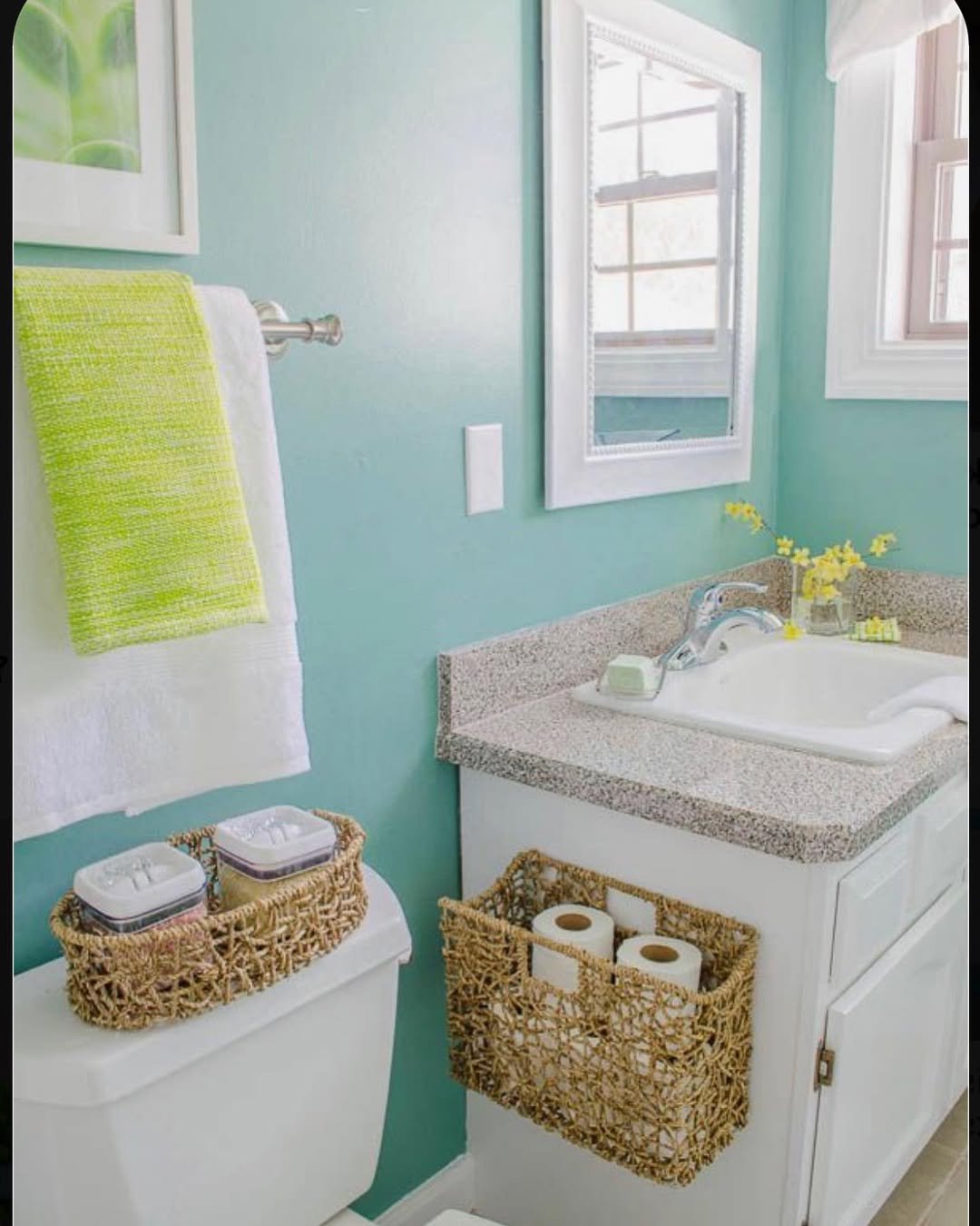 This one leans playful in the best way. That minty wall color instantly lifts the whole room, especially with those woven baskets adding texture and warmth.