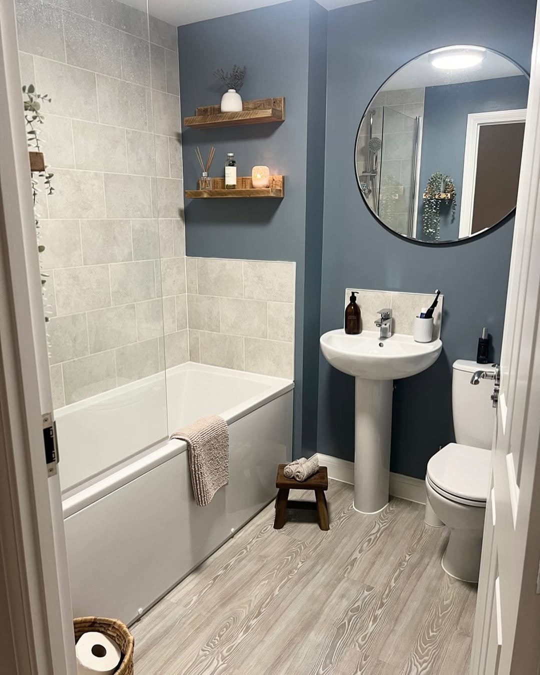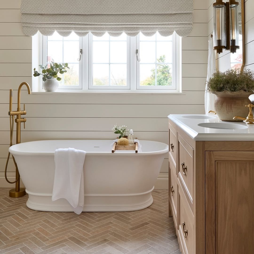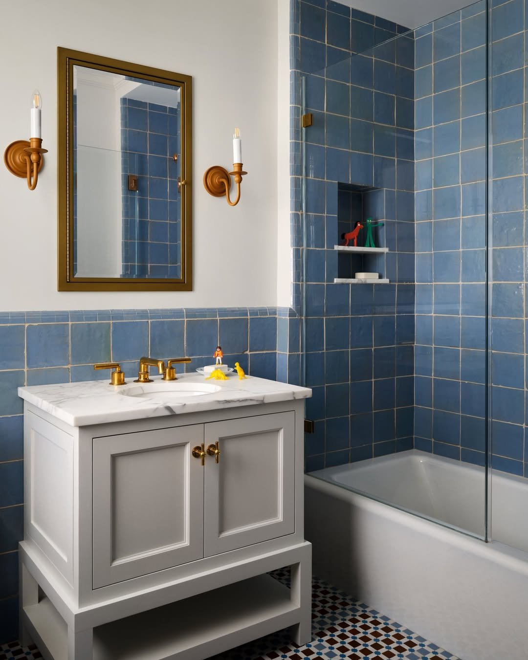 This one feels like a timeless classic with a little twist. The dusty blue tiles wrap the space so beautifully, and paired with those warm brass fixtures—it’s giving heritage, but polished.