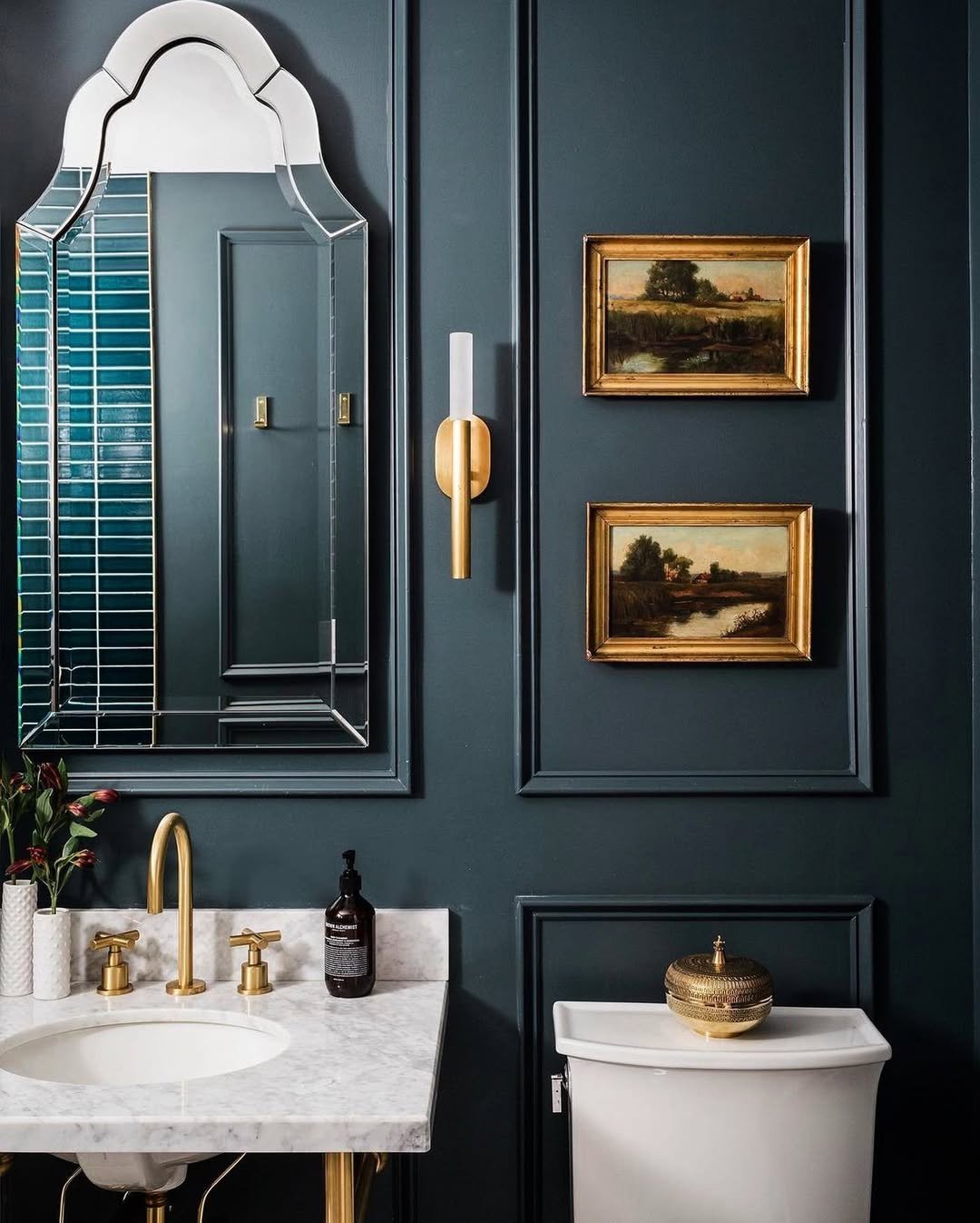 This one leans all the way into drama—and it works. That rich teal paired with brass details and classic molding feels bold but incredibly put together.