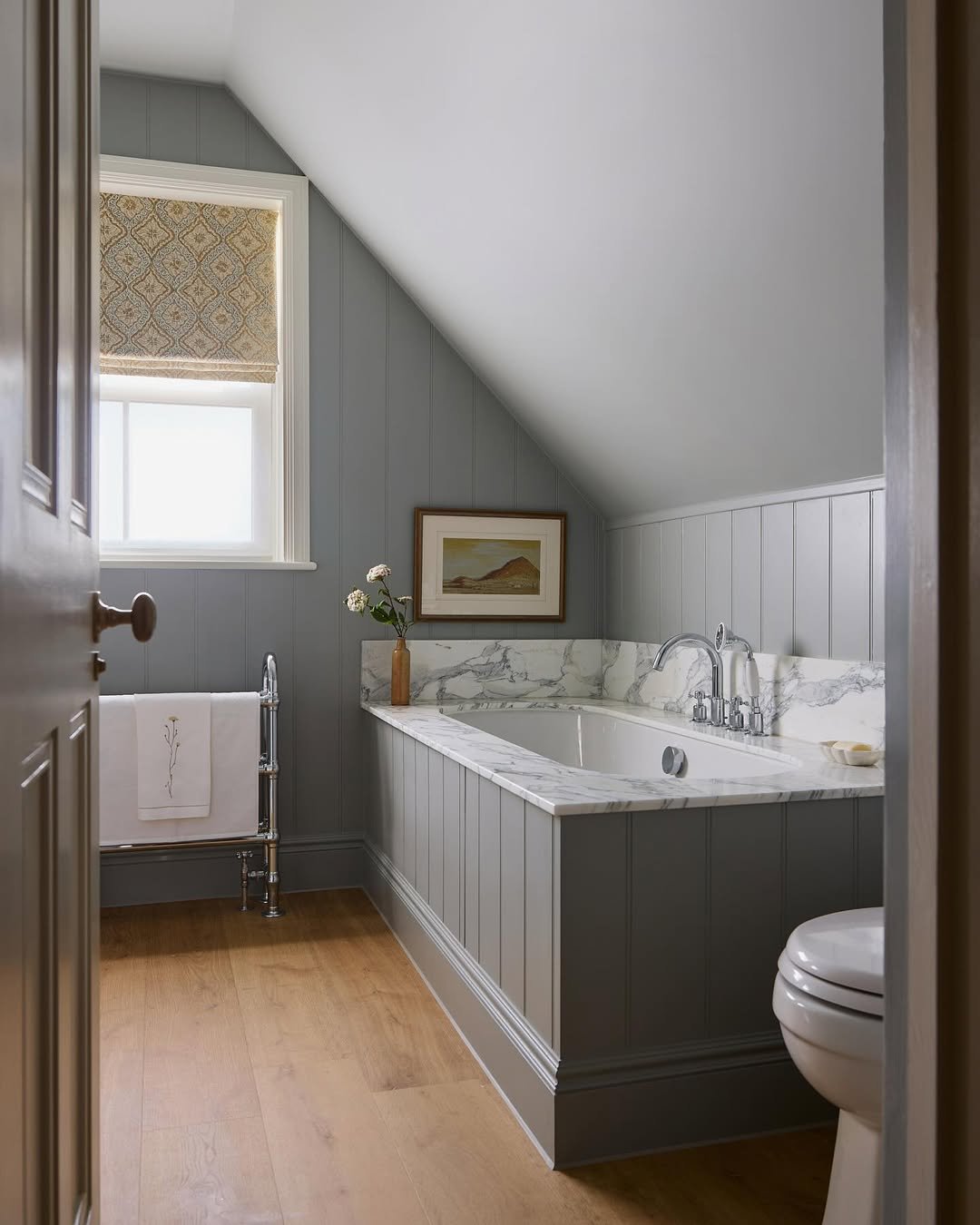 That muted blue under the sloped ceiling? It’s doing a lot of work—in the best way. It softens the angles, makes the space feel bigger, and adds just enough color without overwhelming it.
