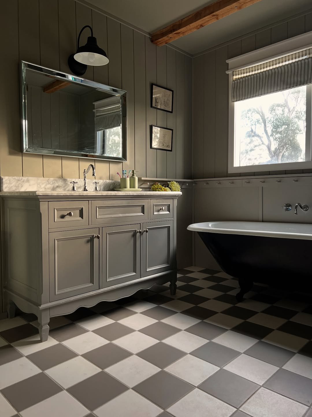 There’s something a little cinematic about this one. That deep olive paneling with the checkerboard floor and clawfoot tub—it feels like a quiet countryside escape.