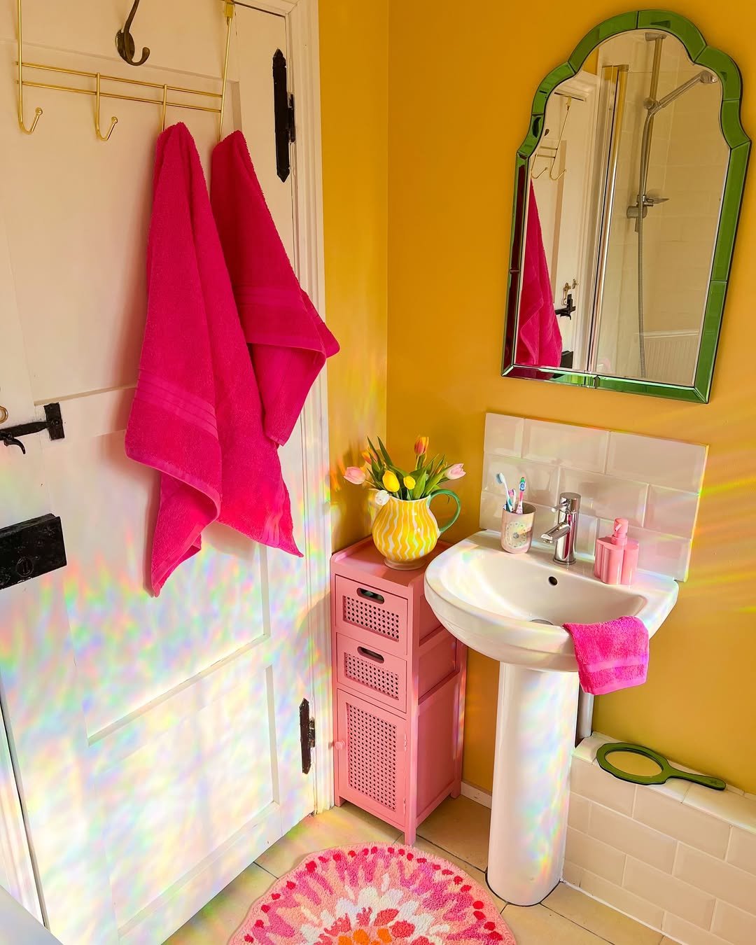 This one’s pure joy. The bold yellow walls mixed with those punchy pink accents feel like stepping into a happy little moment you didn’t know you needed.