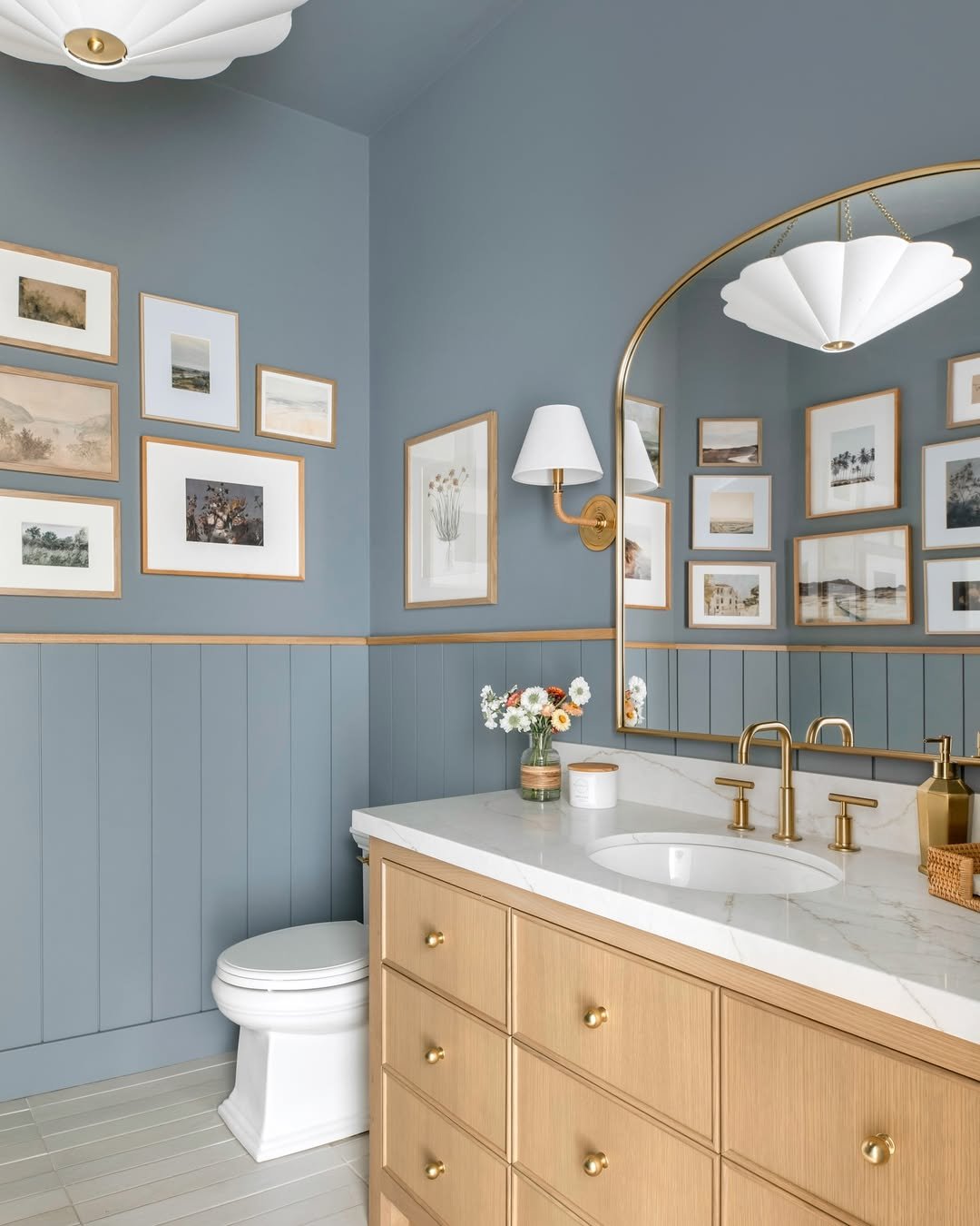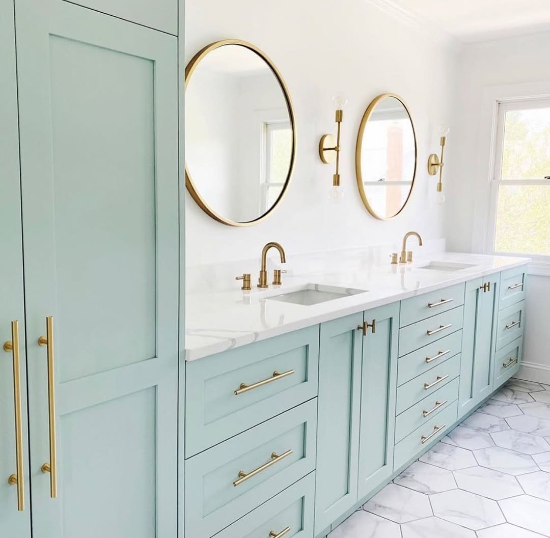 This one feels fresh but still polished. The soft blue walls bring in that light, airy vibe, while the brass fixtures add just enough warmth to keep it from feeling cold.