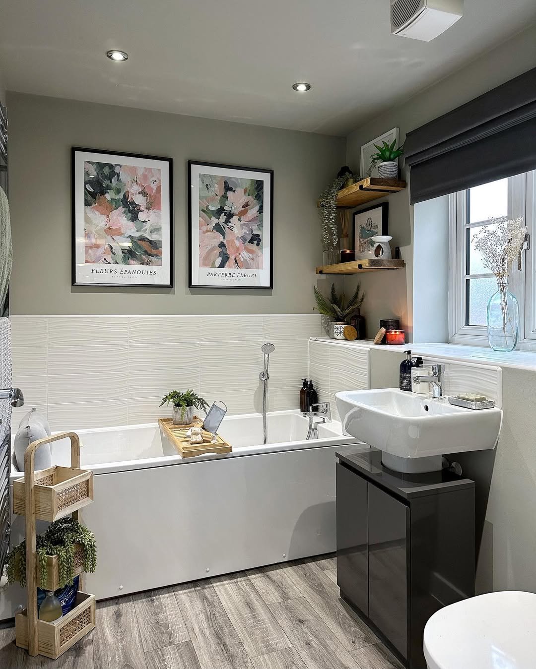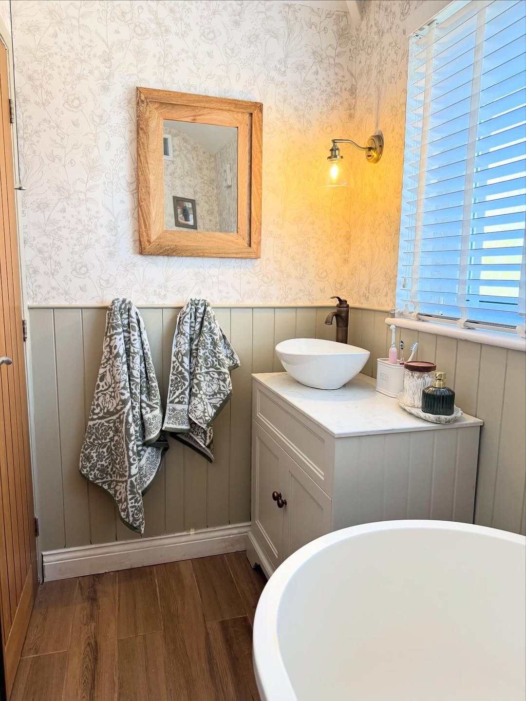 This one feels like a quiet Sunday morning. That muted sage paneling paired with delicate floral wallpaper just wraps the whole space in this calm, lived-in charm. It’s soft without being boring, and the wood tones keep it grounded so it doesn’t float off into “too precious” territory.