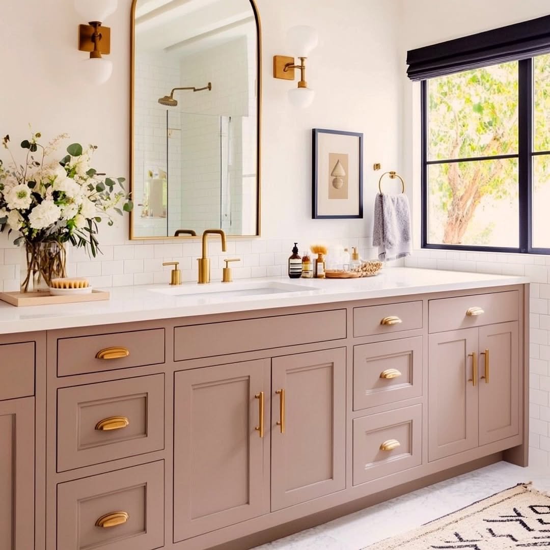 This shade of taupe is doing all the heavy lifting here. It’s subtle but rich, especially paired with those gold accents and clean white surfaces.