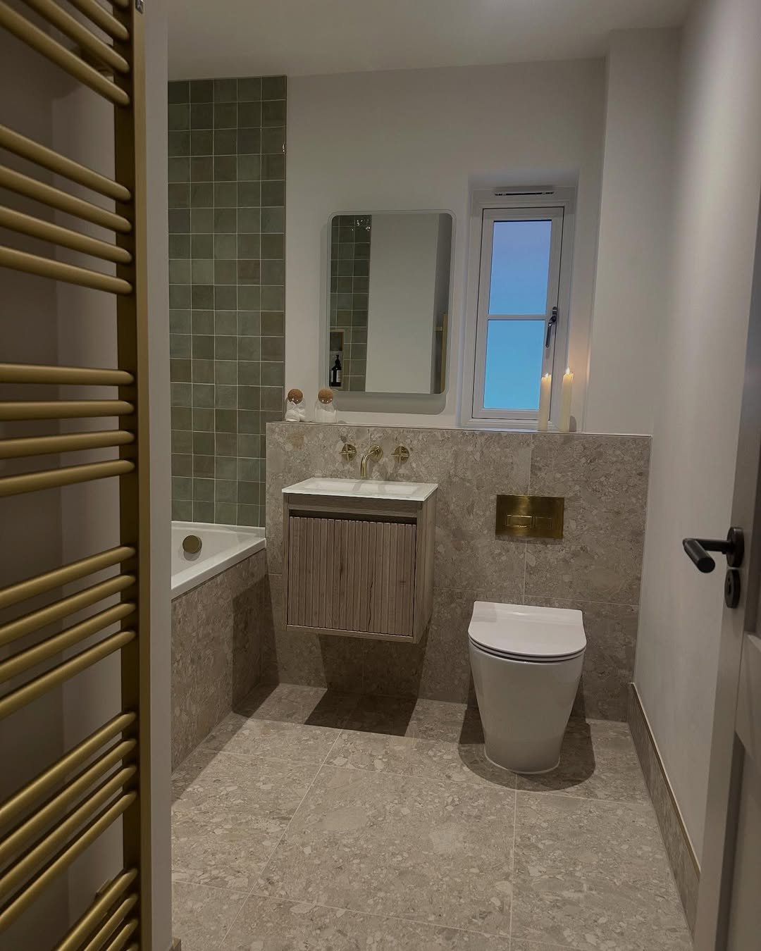 There’s something really satisfying about this palette. Soft beige tones, a hint of green tile, and those warm brass details—it all just blends so smoothly.