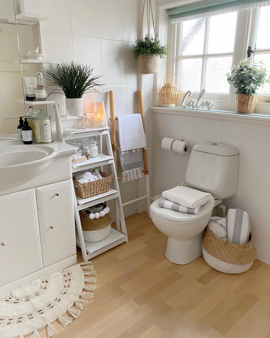 This one leans into that soft, cozy aesthetic. Light wood tones, woven baskets, and plants tucked into every corner without overwhelming the space.