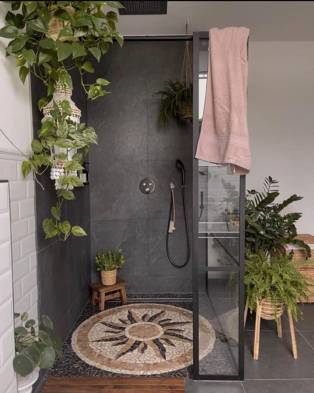 This one has personality all over it. Hanging plants, floor plants, even a little stool moment—it’s layered but still feels relaxed. That circular mosaic floor? Yeah, it’s doing a lot (in a good way).