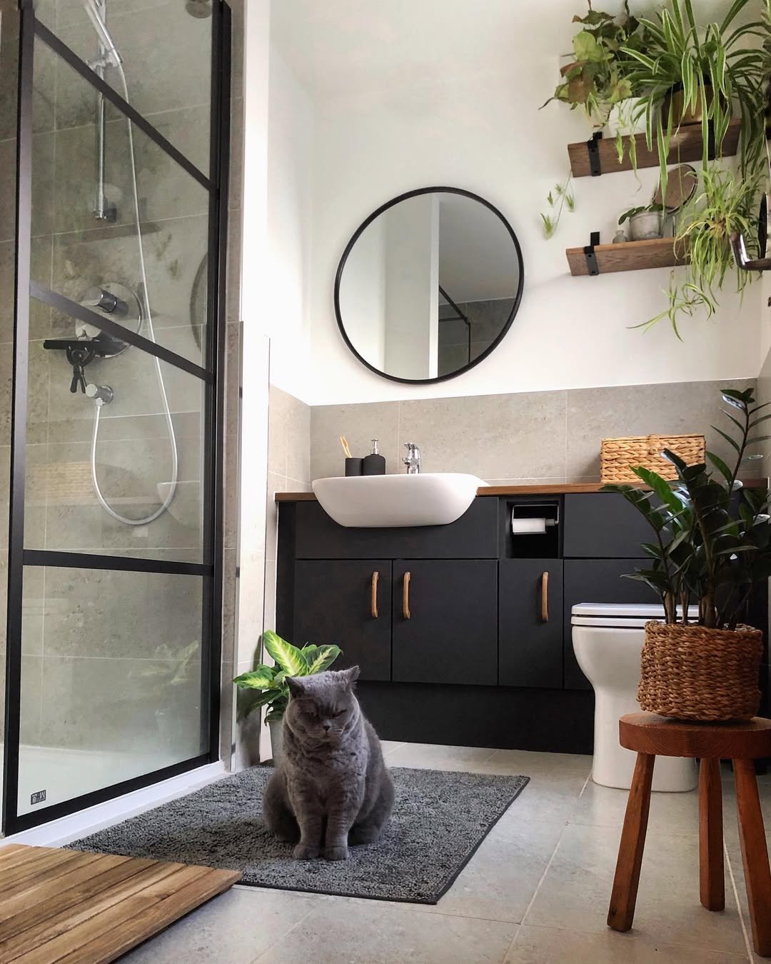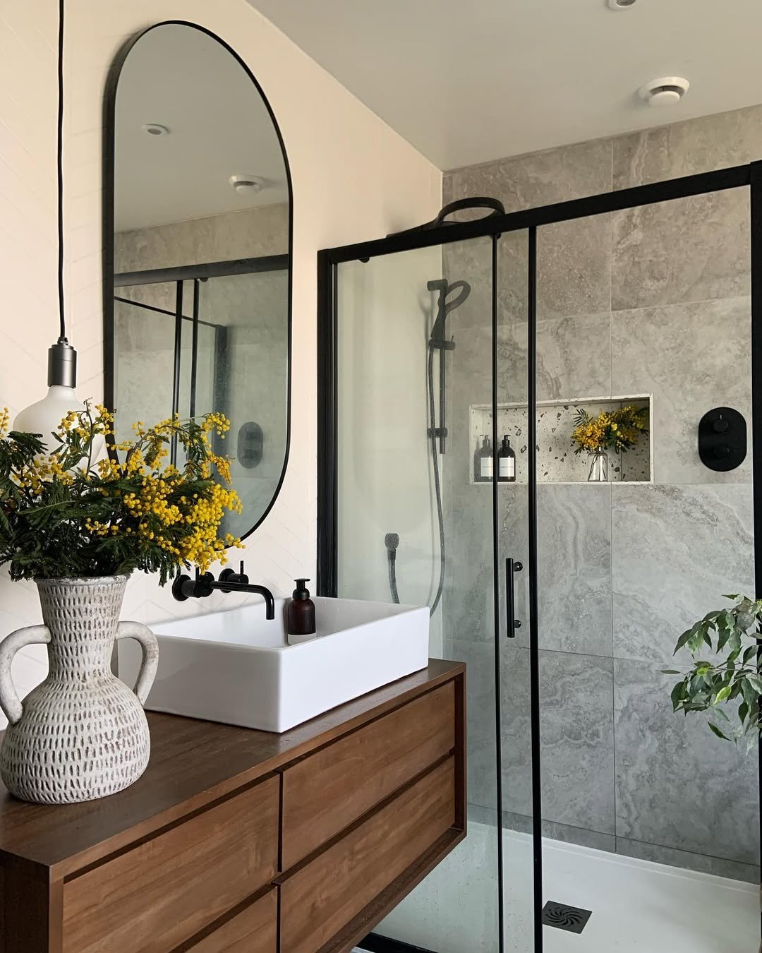 Clean, calm, and quietly elevated. The muted stone tiles and black accents feel super modern, but that simple plant moment near the shower keeps it from feeling too sharp.