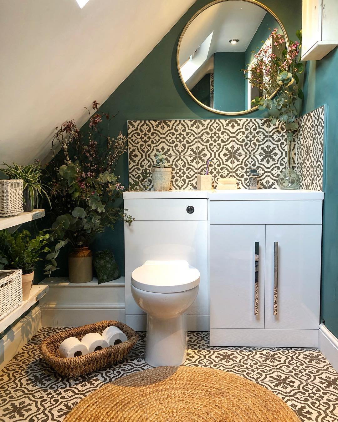 This little corner is doing so much with so little. Deep green walls, patterned tiles, and soft plant touches tucked into shelves and corners.