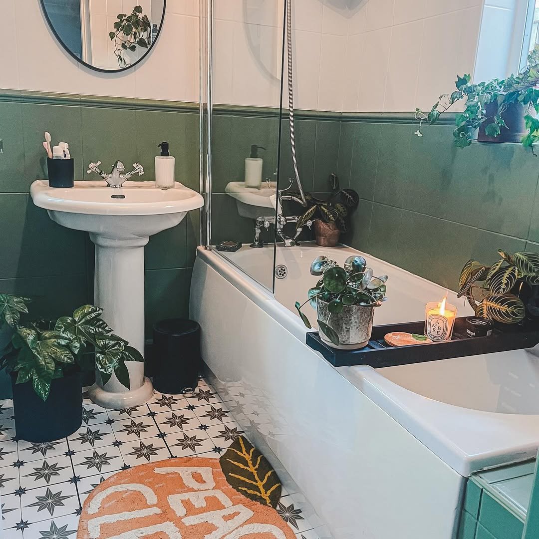 This one feels lived-in in the best way. The mix of green tiles, soft lighting, and those leafy plants tucked around the tub gives it that cozy, end-of-day unwind energy.