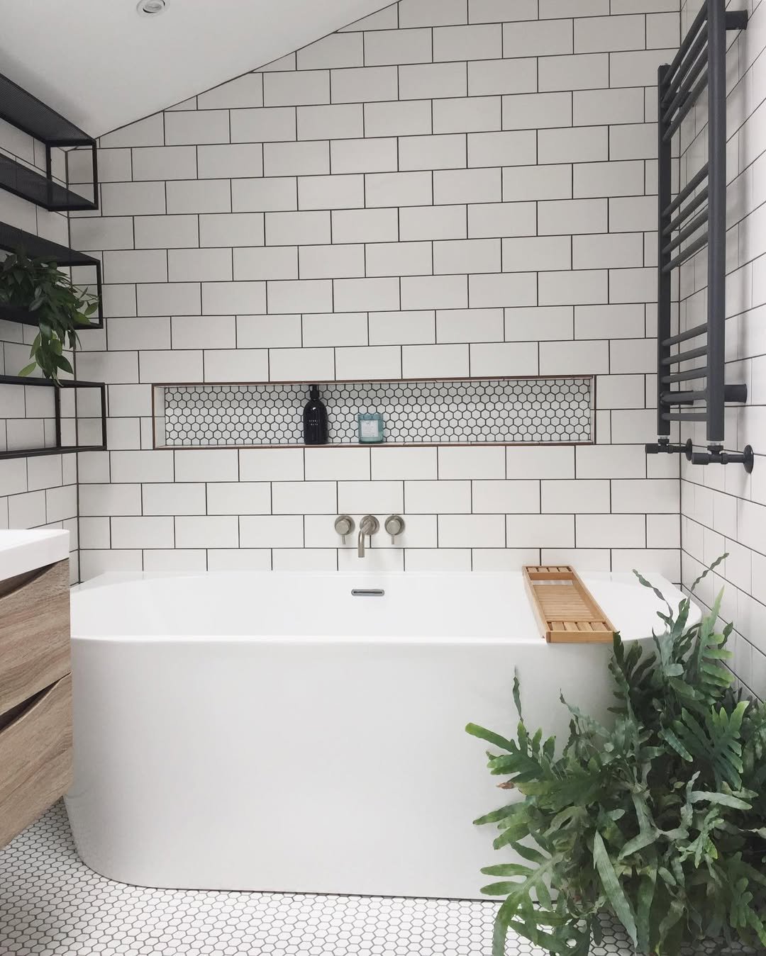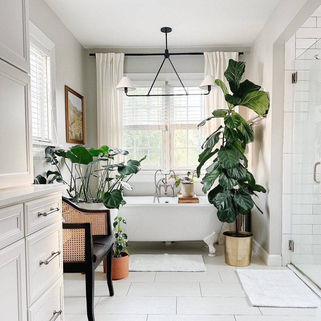 This is that clean, classic look—but elevated. White tiles, simple lines, and then that lush green plant by the tub bringing everything to life.