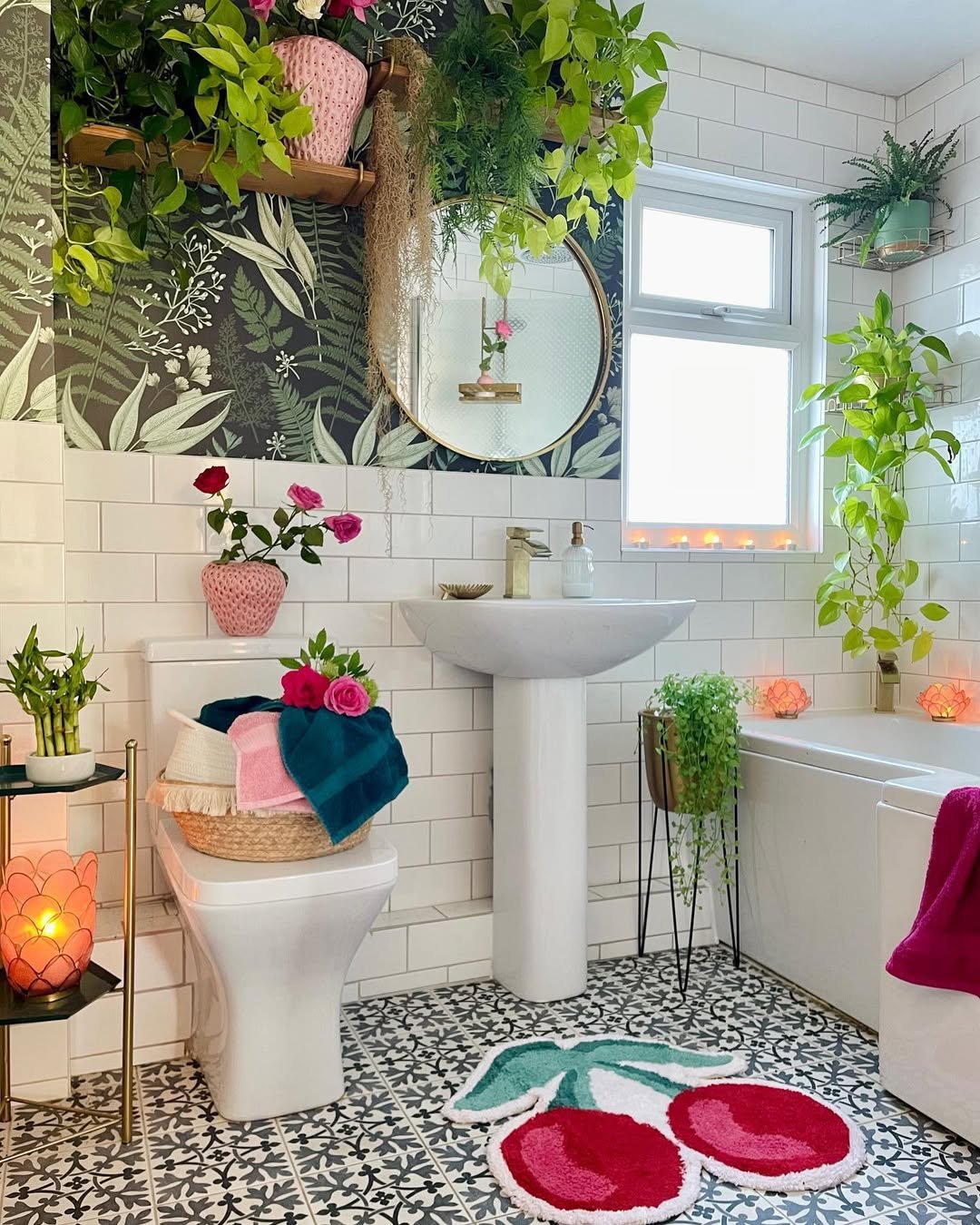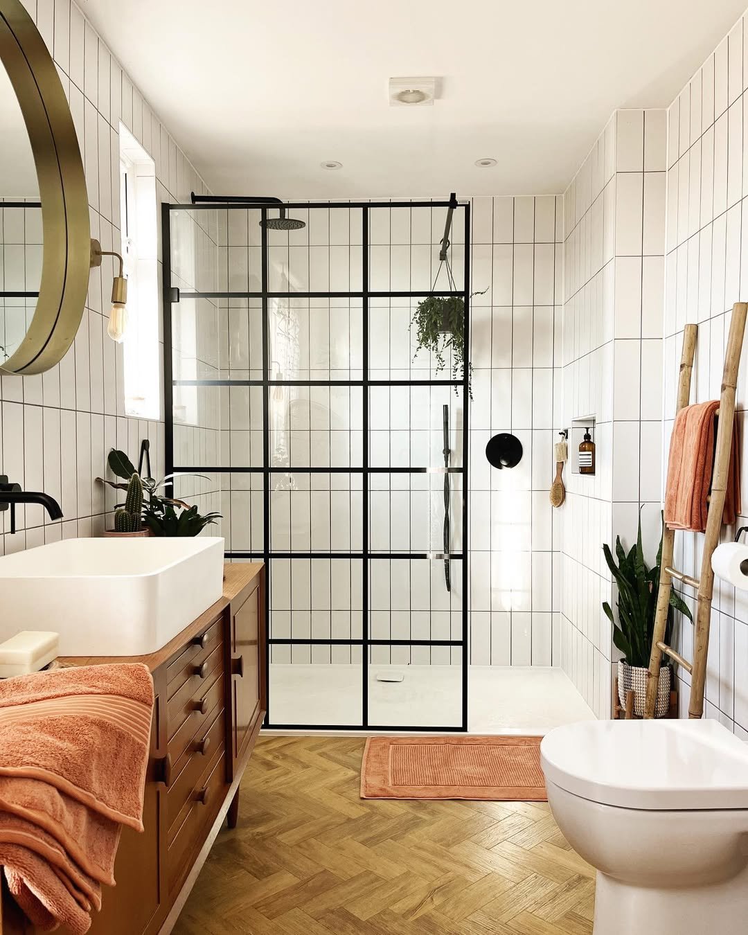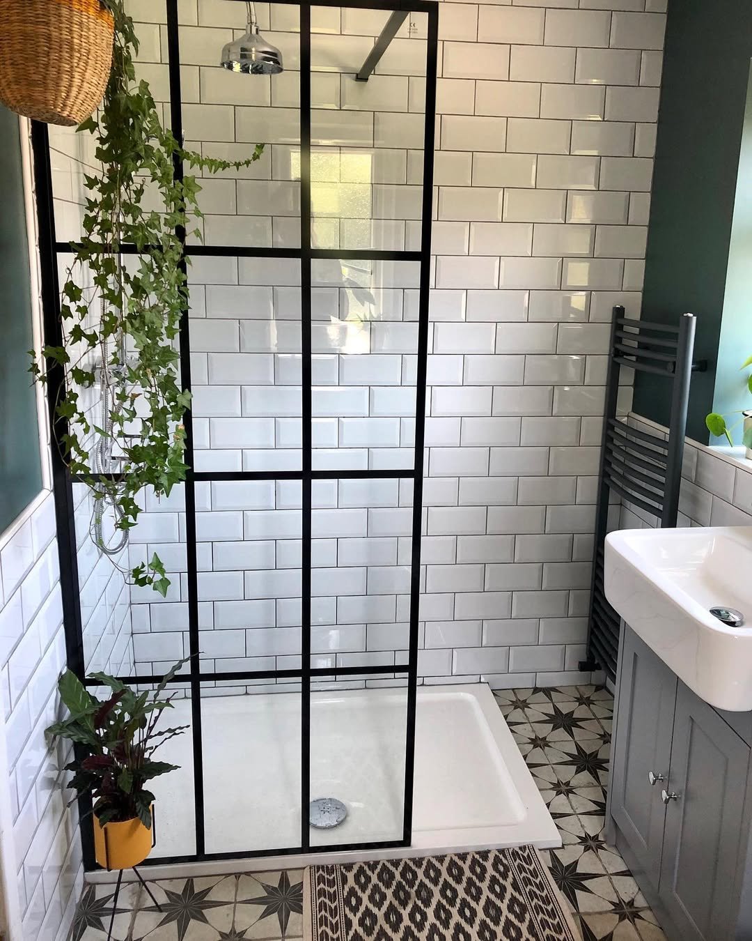This bathroom leans classic with the subway tiles and black-framed shower, but those trailing plants steal the moment. That ivy casually draping down? It’s giving effortless charm.