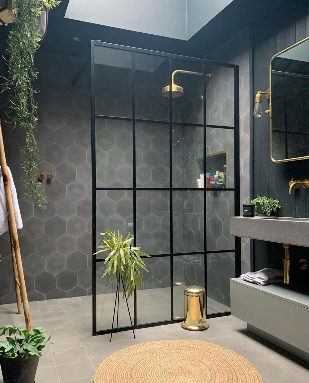 This one leans all the way into moody, and it works. Those rich green tiles paired with black-framed glass give the space that sleek, almost spa-meets-boutique-hotel vibe.