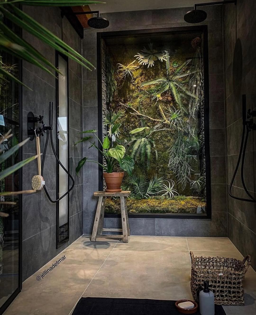 Now this is how you commit to a vibe. Dark tiles, moody lighting, and plants that feel like they’ve taken over—in the best way possible. It’s giving indoor rainforest, but make it sleek.