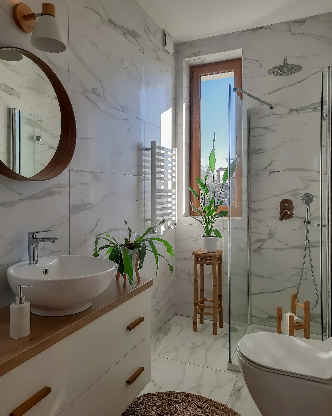 If bathrooms could whisper, this one would. Soft marble, natural light, and those simple green plants placed near the window—it’s all very serene.
