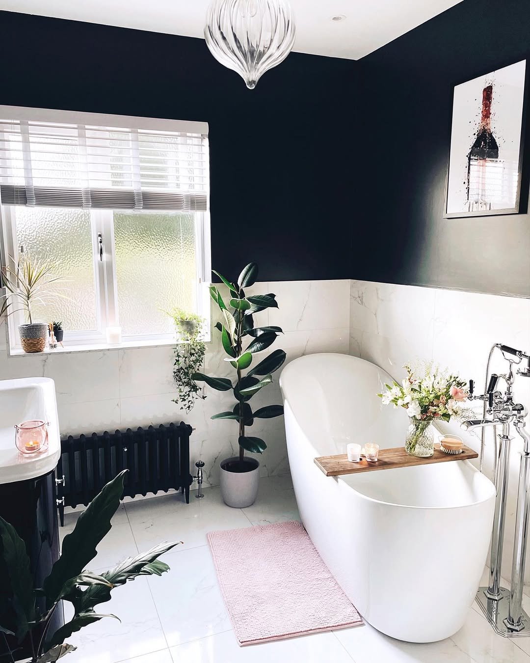 This one feels like stepping into a quiet little escape. Deep navy walls, soft marble finishes, and then—those plants—just casually bringing life into the corner like they belong there. The rubber plant by the tub? Perfect choice. Bold, glossy, and just enough drama.
