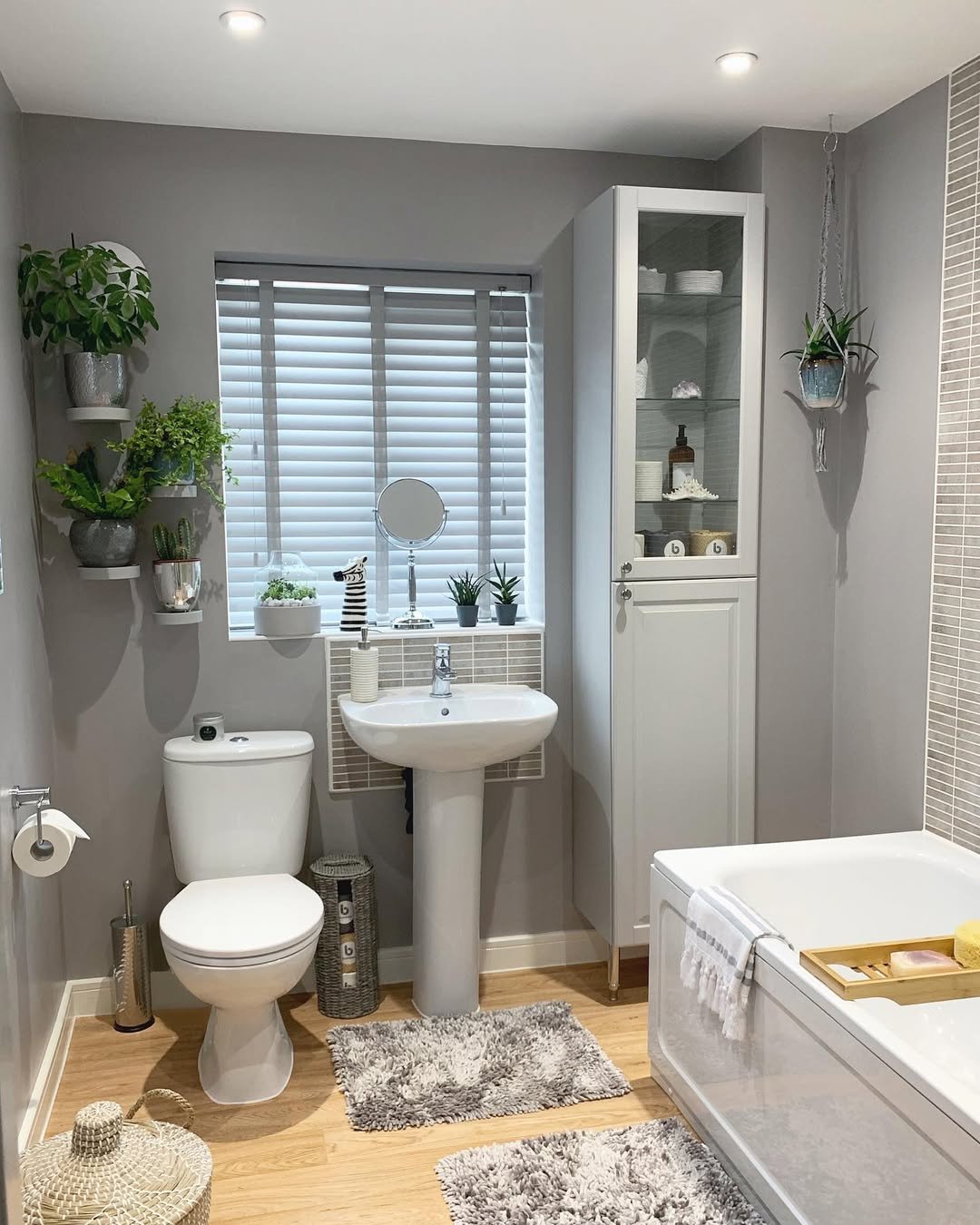 This one feels like a breath of fresh air. Soft greys, white tiles, and plants tucked into every little corner—from the toilet top to the wall shelf. Nothing feels forced, and that’s the charm.