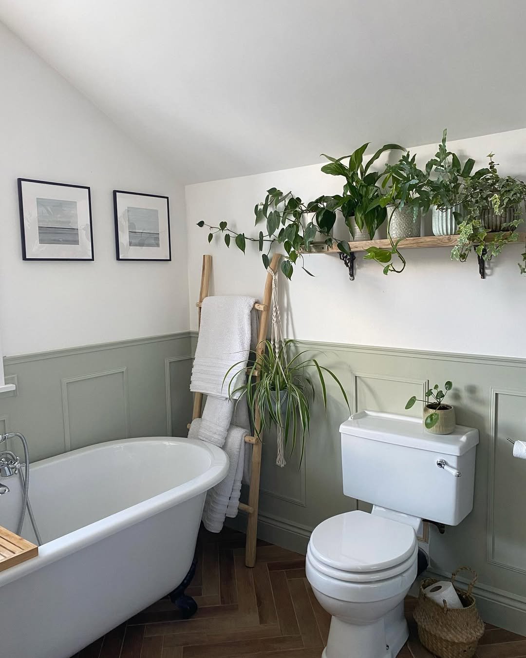 This space just exhales calm. The sage green paneling, soft whites, and that simple wooden shelf layered with trailing plants—it all feels effortlessly put together. Nothing loud, nothing overdone… just quiet confidence.