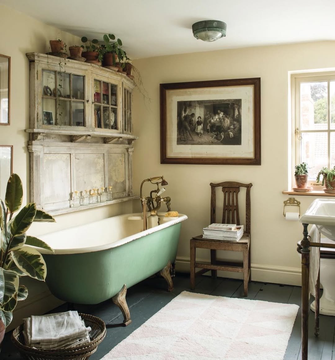 This feels like a storybook moment. That aged cabinet, the clawfoot tub, and plants tucked along the top like they’ve been there for years—it’s giving old-world charm in the best way.