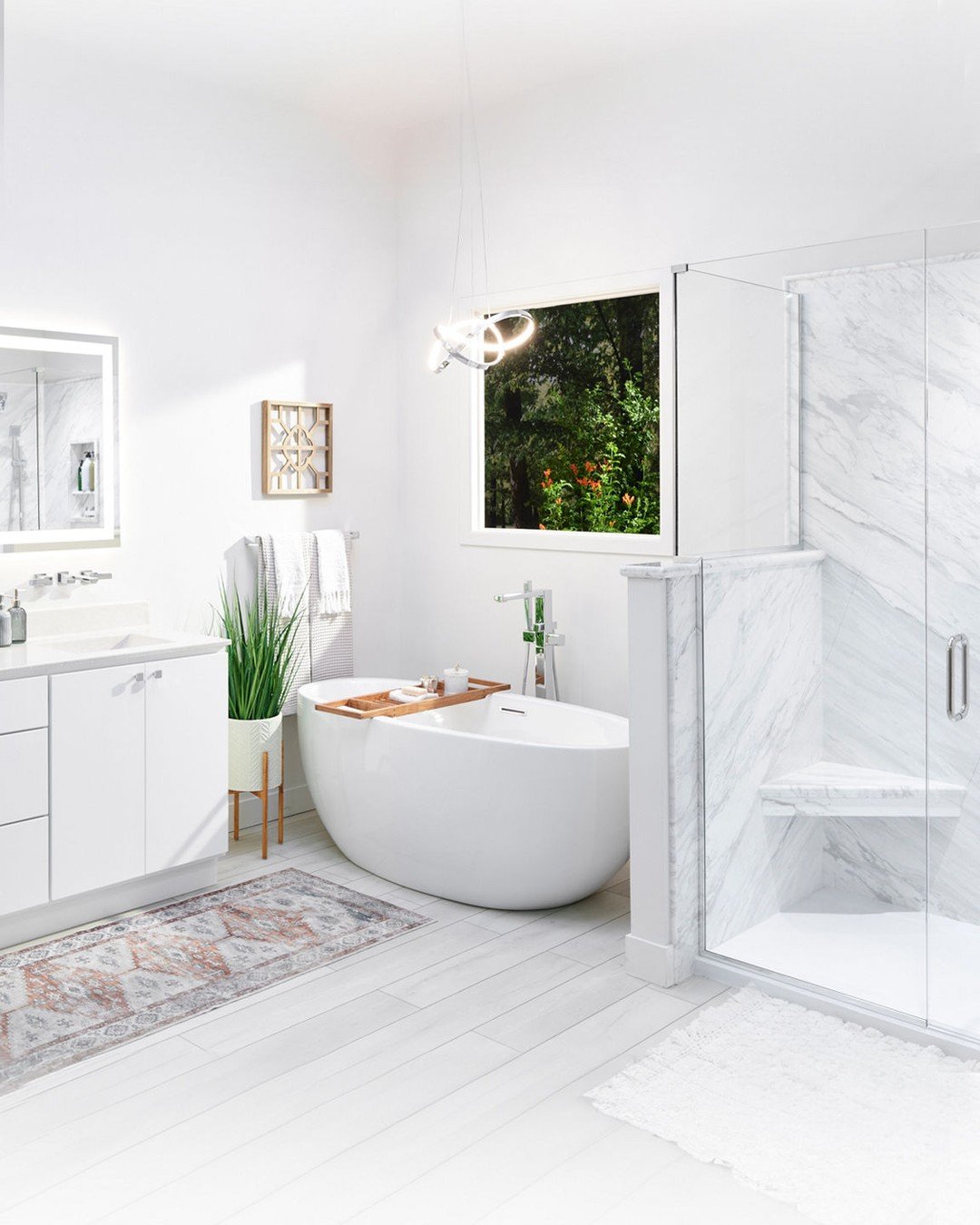 If you like your bathrooms calm and clutter-free, this is it. The all-white palette, paired with soft textures and a freestanding tub, creates that instant spa vibe.