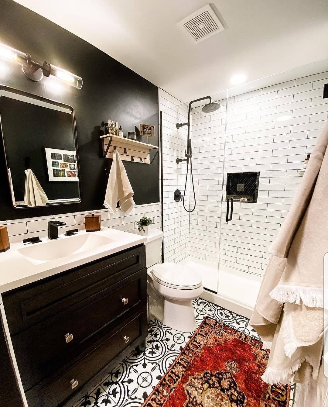 Black and white never misses—and this space proves you don’t need a massive budget to make it work. The matte black wall gives instant depth, while the white subway tile keeps things crisp and clean.