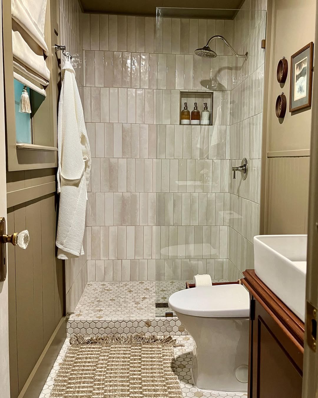 The mix of textures keeps it from feeling flat, while the glass shower maintains that open, airy vibe. It’s understated, but definitely not boring.