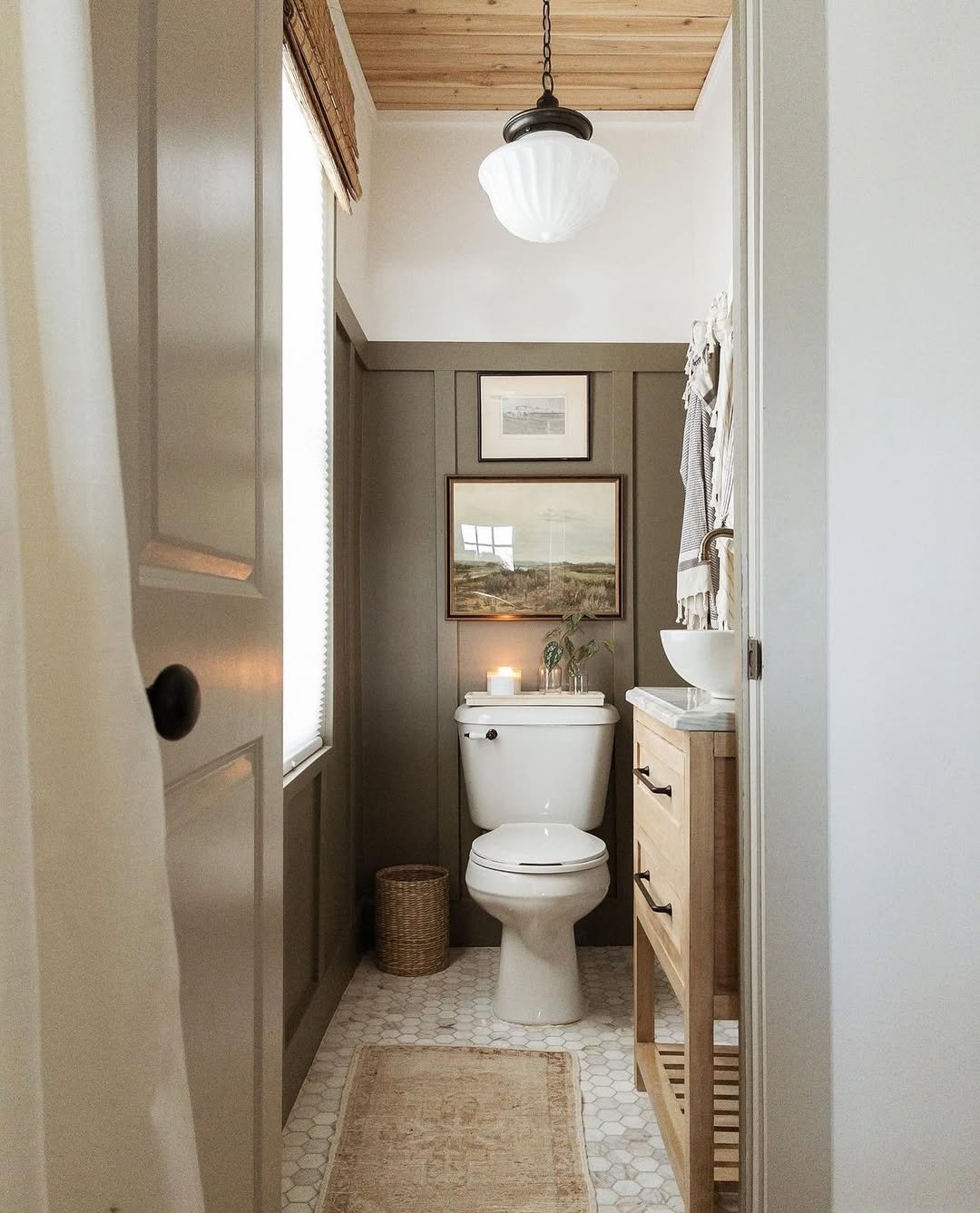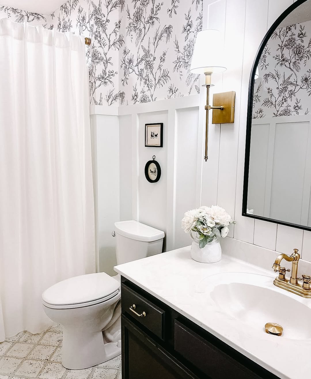 This bathroom leans into charm in the best way. The floral wallpaper paired with paneling creates this layered, almost storybook feel that’s cozy without being overdone.